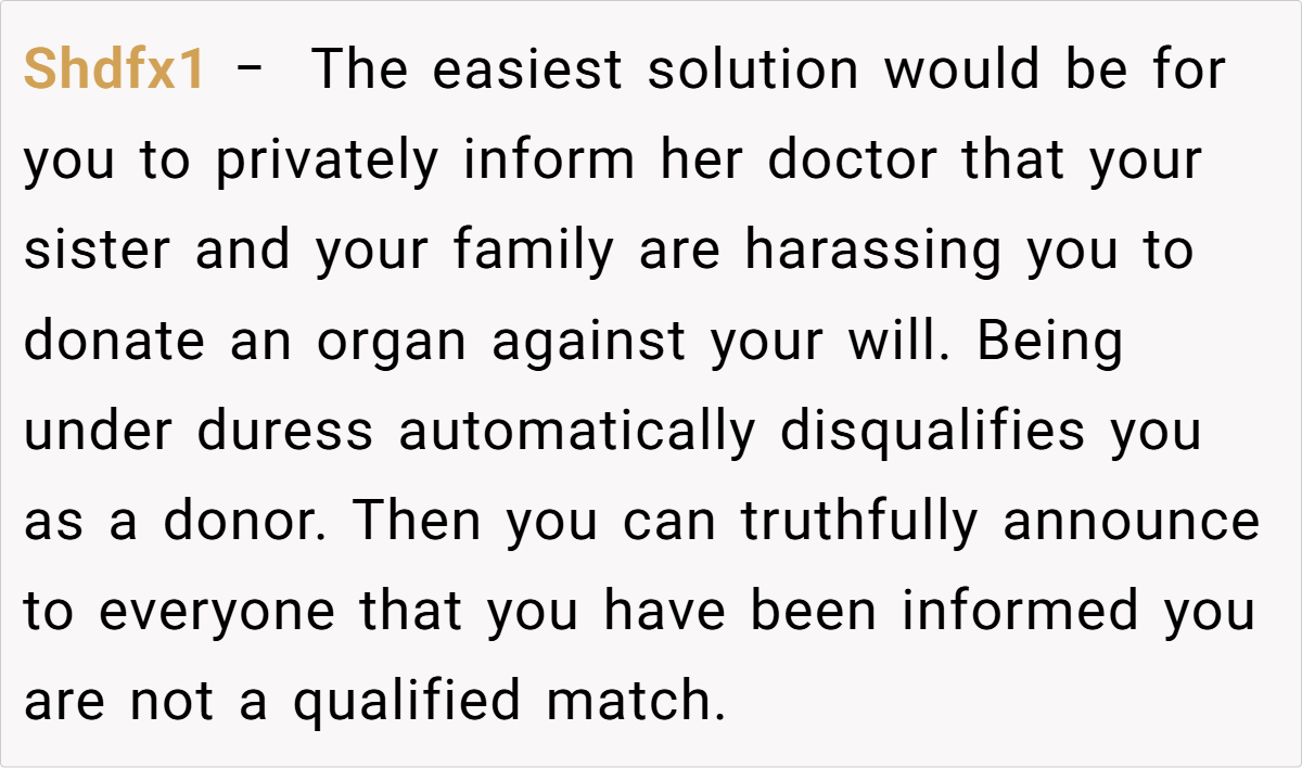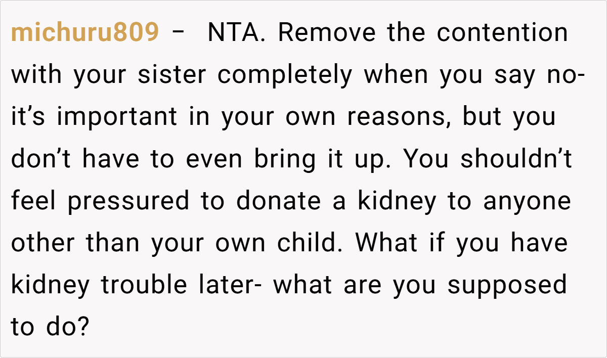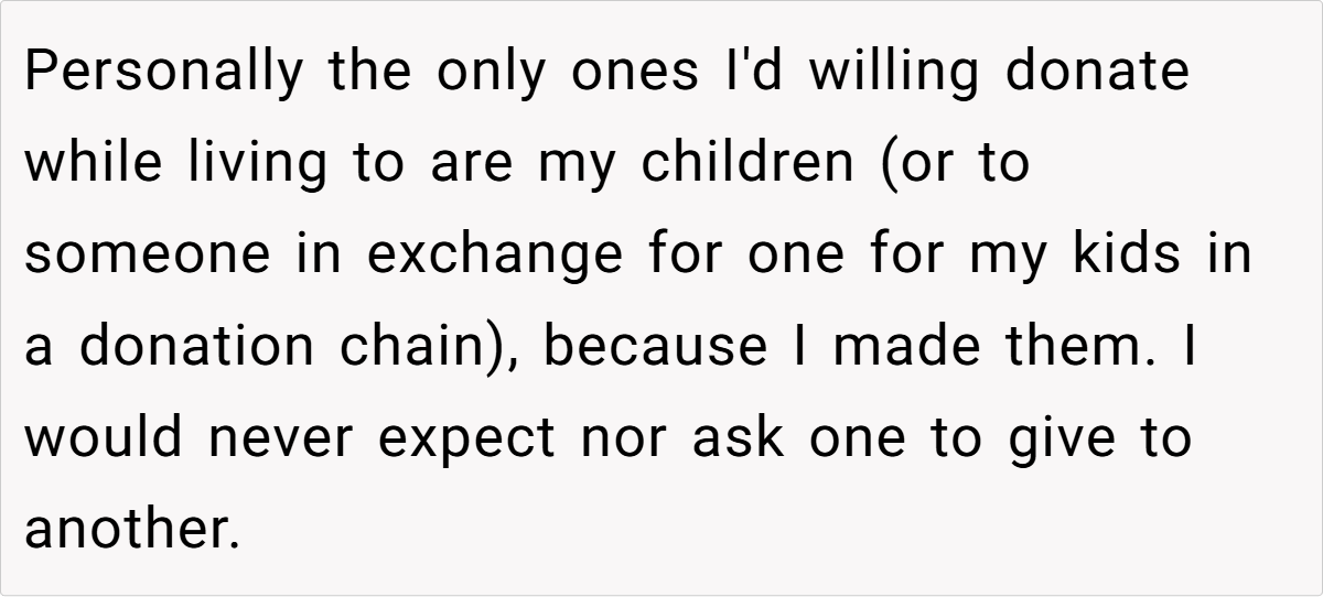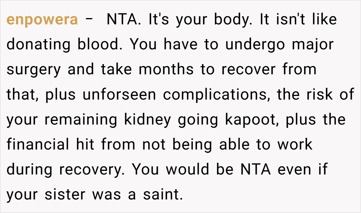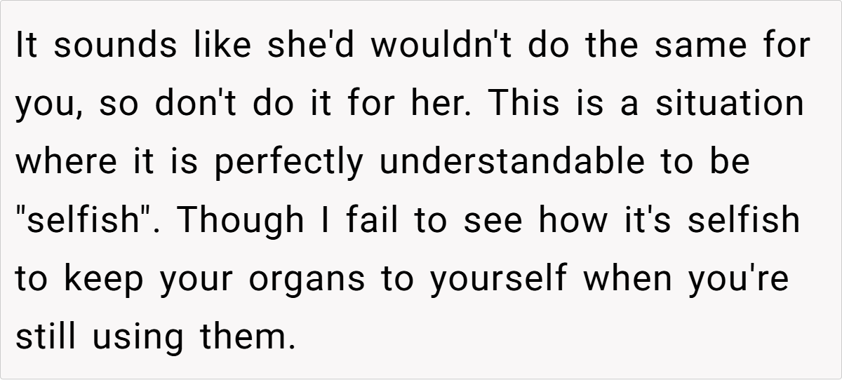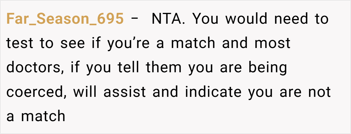 Across Reddit, responses to this post were overwhelmingly supportive of the decision to refuse donation. Many commenters emphasized that no one should be forced to risk their health under duress or as a means of atoning for past familial abuse. Users pointed out that if donors express discomfort or feel coerced, transplant centers will not proceed. The consensus was clear: your body is your own, and making such a significant decision should come from a place of genuine willingness rather than guilt or obligation.