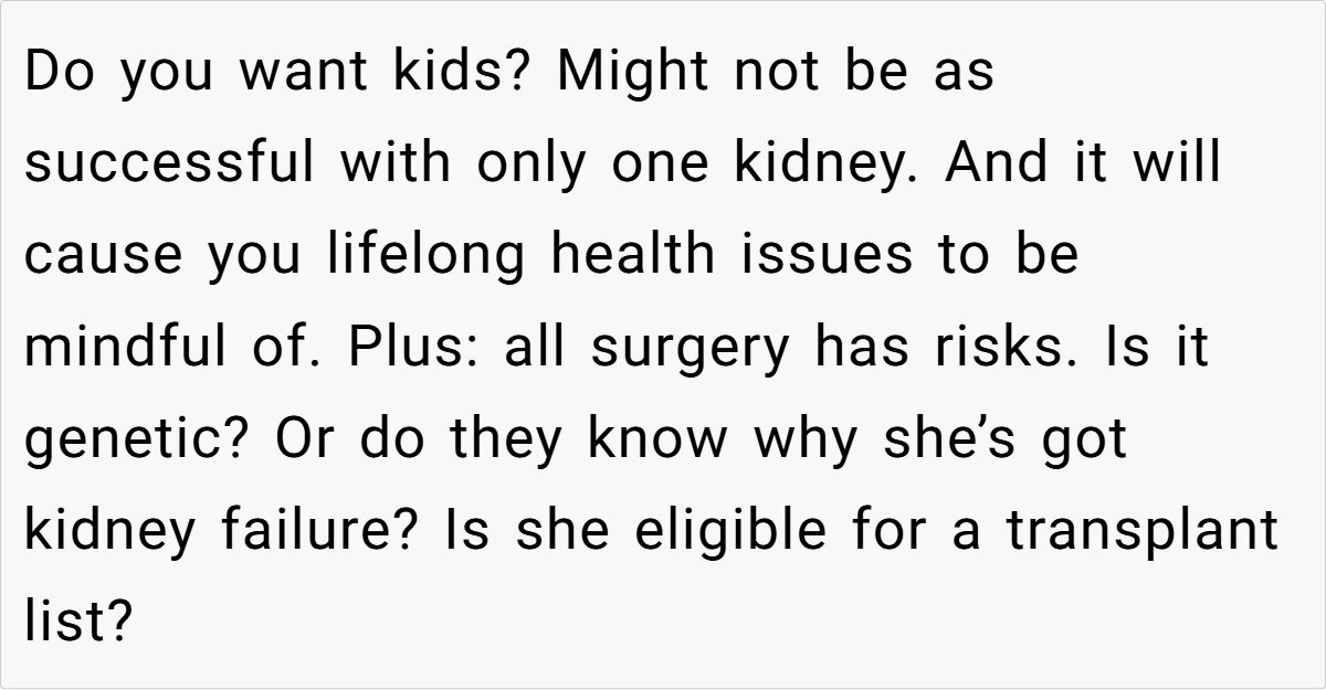 Ultimately, while the urgency of the sister’s condition is undeniable, the choice to donate an organ is one that reverberates through the rest of your life. For many, this decision intertwines with their sense of identity, self-worth, and emotional history. Experts unanimously stress that honoring your own feelings isn’t selfish—it’s essential. Taking care of your mental and physical health should always be a priority, even when family expectations push you toward an act that feels contrary to your well-being.