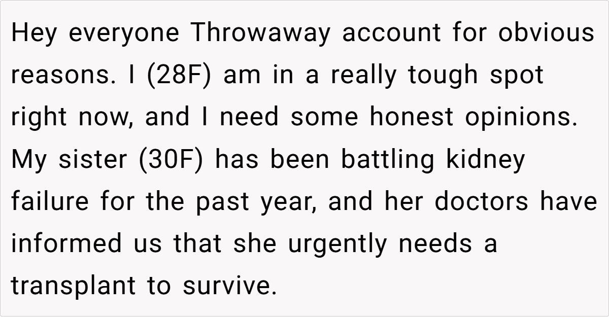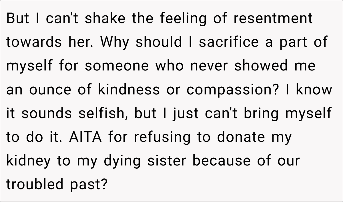 ‘AITAH for refusing to donate my kidney to my dying sister because she bullied me throughout my childhood and never apologized?’