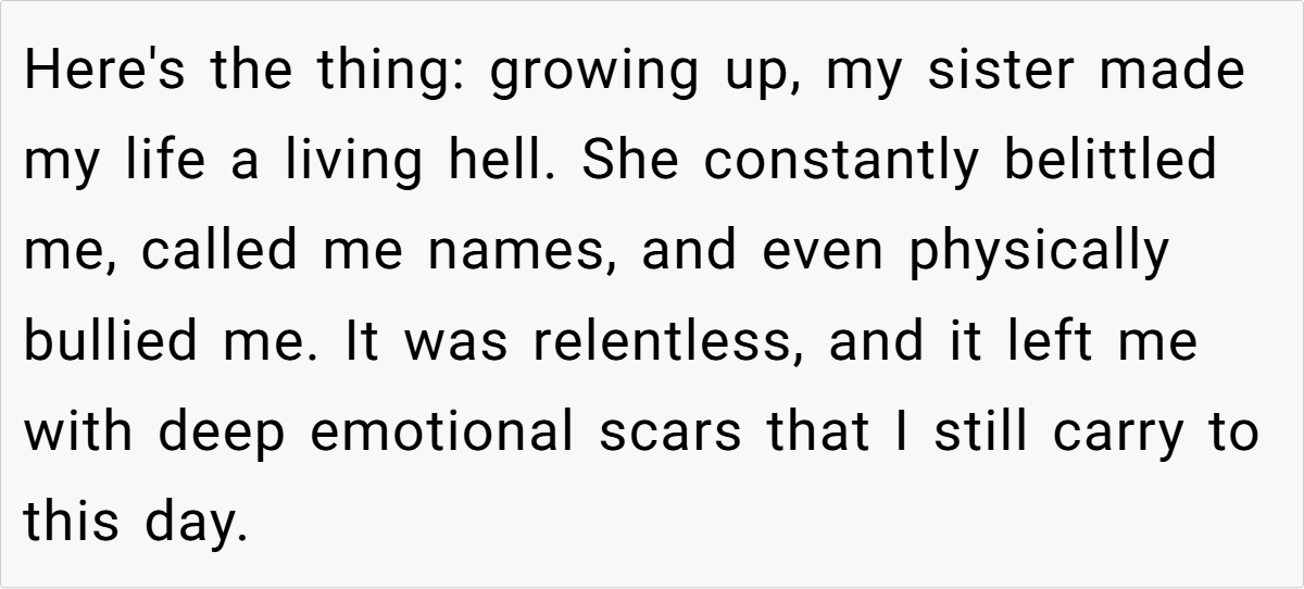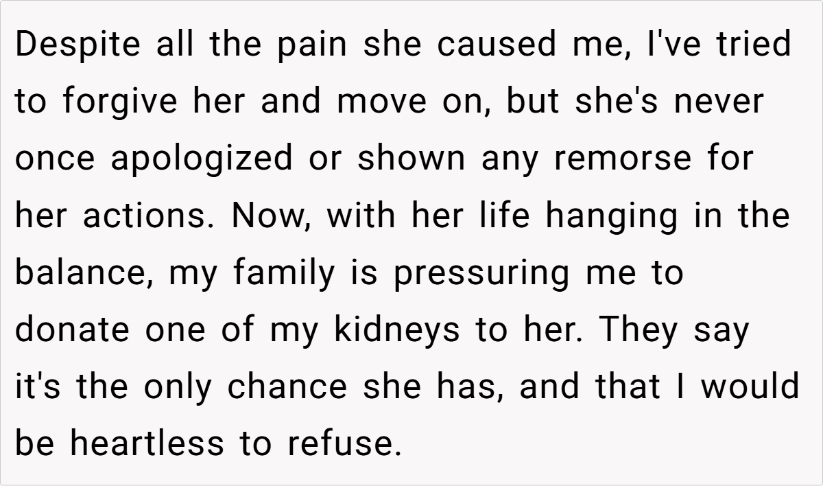 This emotionally charged story shines a light on the complex interplay between past trauma and present decisions. It raises an essential question: Should one sacrifice a part of oneself for a family member who never made amends for old wounds? While the sister’s need is urgent, your well-being is equally important.