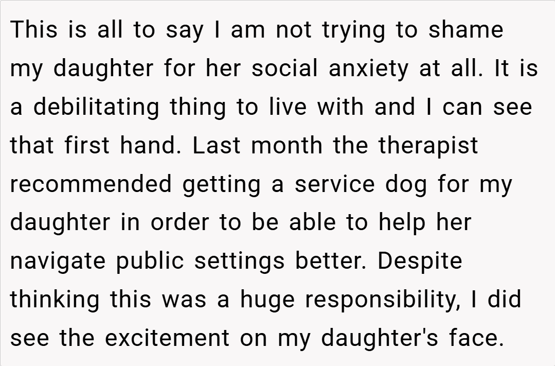Furious and heartbroken, the mother decided two things: the daughter would no longer receive a service dog—a tool meant to help her overcome social anxiety—and she must pay off the expensive vet bill by getting a part-time job. While the daughter’s behavior was undeniably reckless, her severe anxiety makes this punishment a particularly delicate matter.