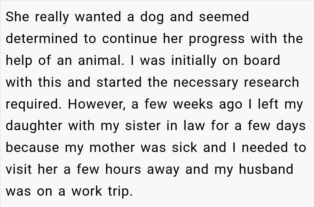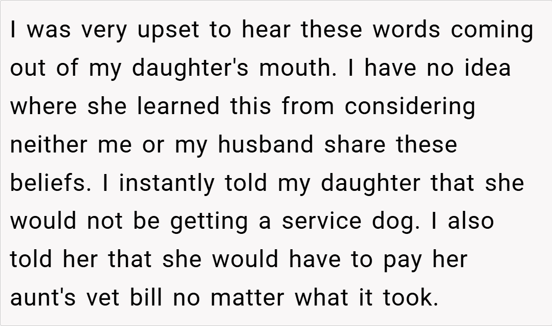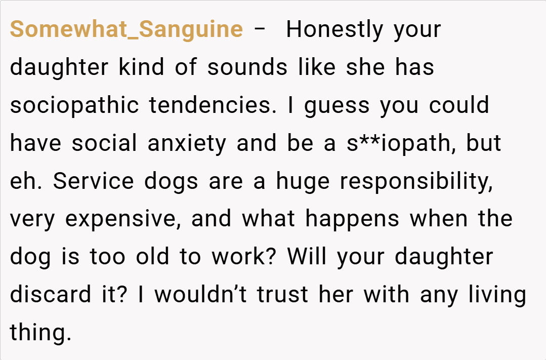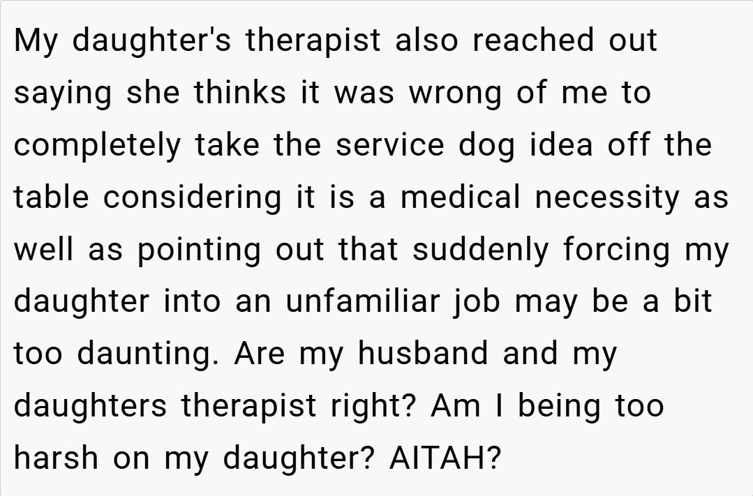 Her husband and her therapist have both expressed concern that completely scrapping the service dog plan and forcing a job might be too harsh, given her mental health needs. Now the mother is left wondering if she’s overstepped, or if her actions are justified by the gravity of the situation. Was she wrong for using these consequences to hold her daughter accountable, or is this a necessary stand to prevent future harm?