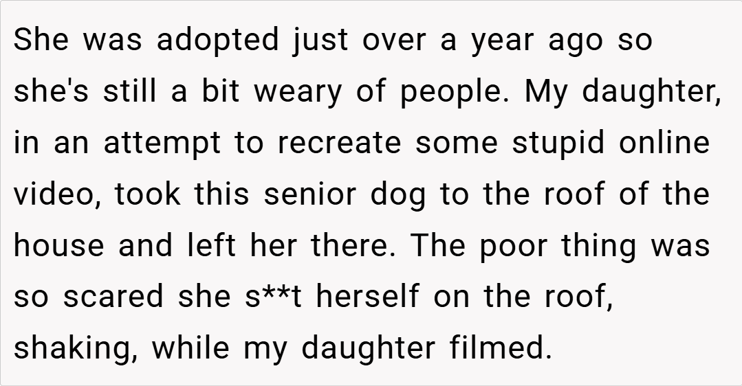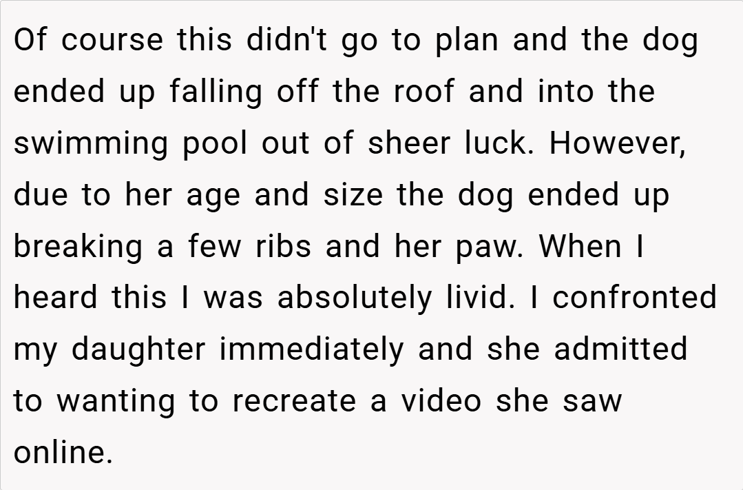 When a moment of reckless behavior leaves lasting scars, the fallout can force parents to make tough decisions. In this story, a 45-year-old mother recounts how her 15-year-old daughter with severe social anxiety caused serious harm by trying to recreate an online video with her aunt’s senior dog. In an impulsive moment, the daughter took the dog to the roof, leading to a fall into the pool that broke the dog’s ribs and paw.
