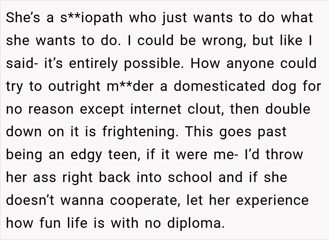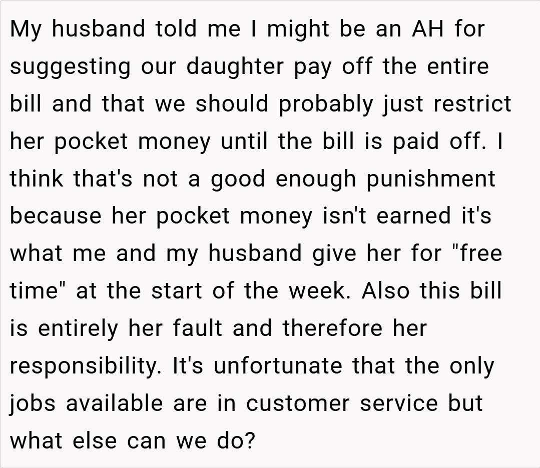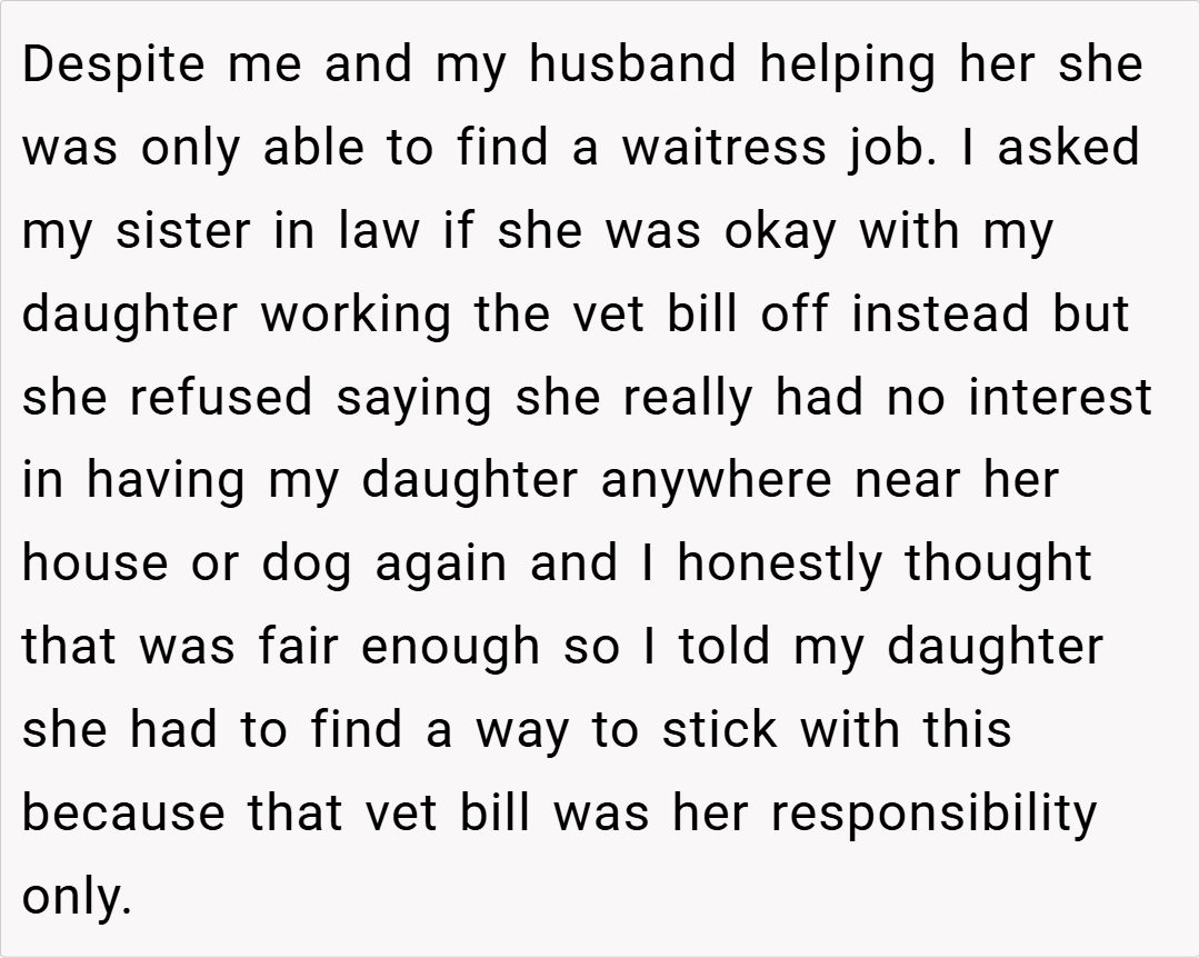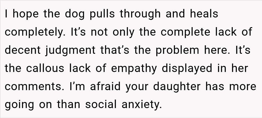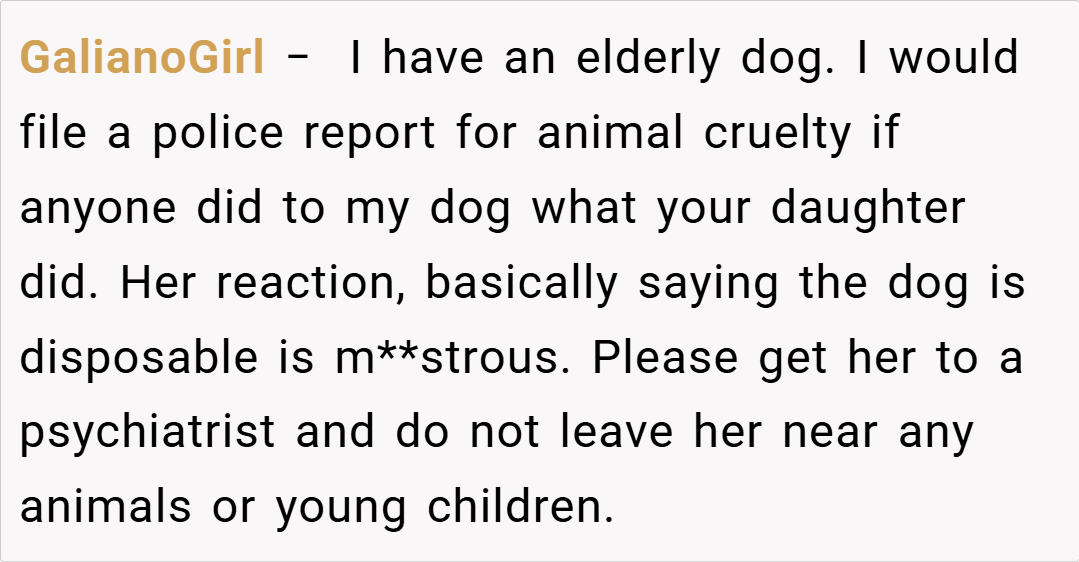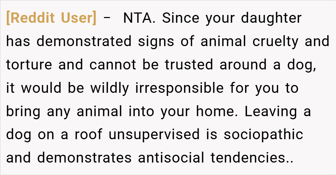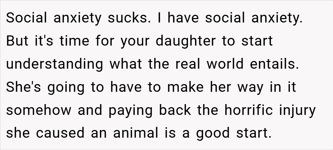 Several redditors expressed strong support for holding the daughter accountable, with one user writing, “Your daughter’s actions endangered an animal and showed a complete lack of responsibility. It’s fair to expect her to face the consequences for her actions—even if it means tough love.”