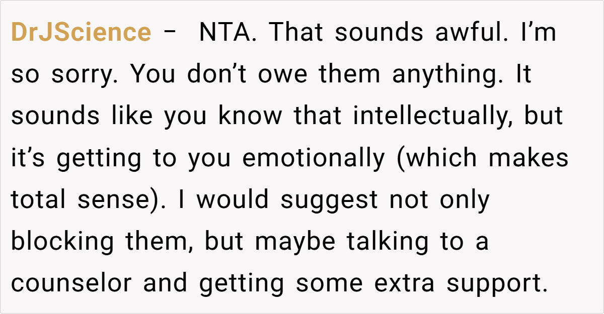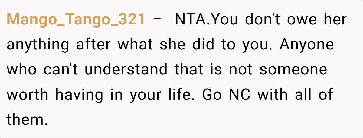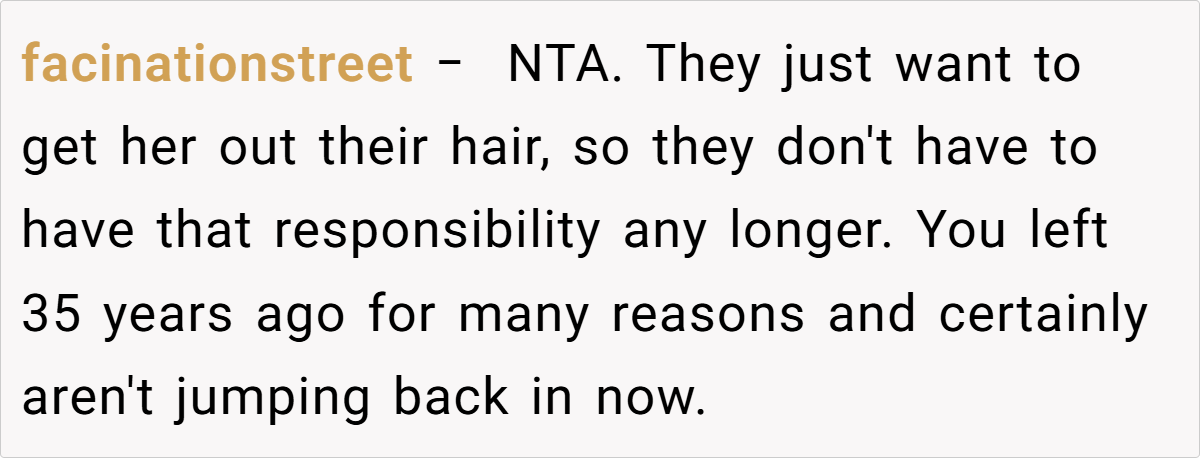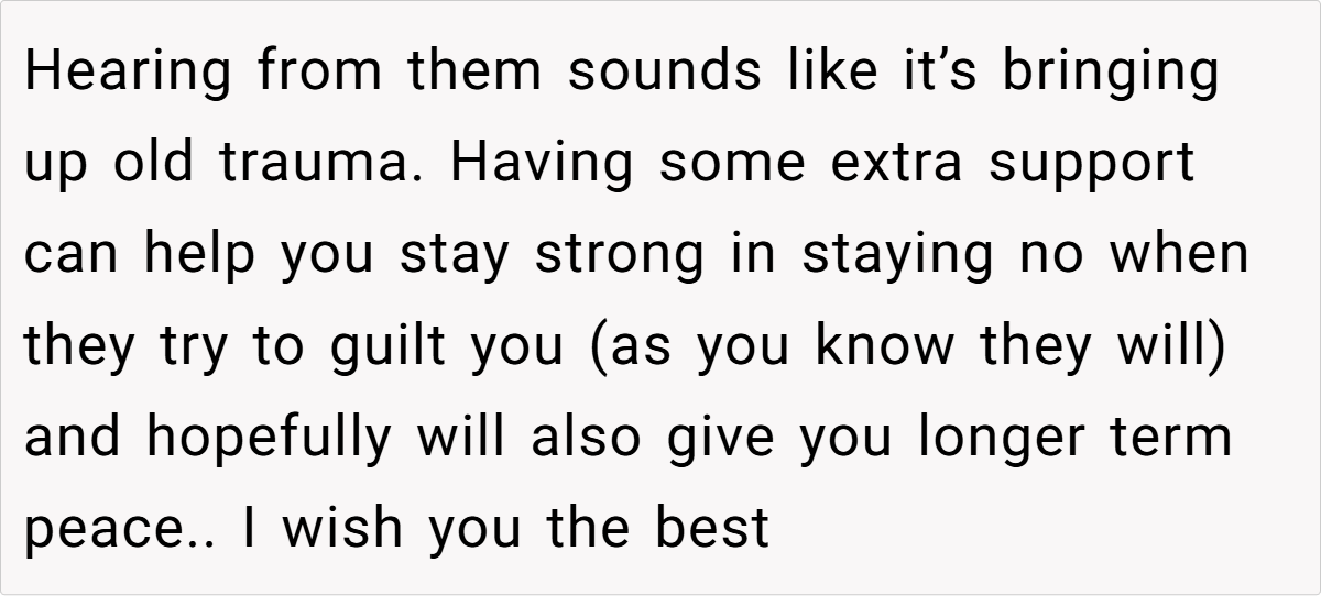 Many commenters on Reddit have expressed strong support for maintaining strict boundaries after enduring prolonged abuse. One commenter noted, “After 35 years of cutting ties, anyone expecting you to suddenly reconcile is out of touch with the harm done.” Others agreed that if the abuse was as severe as described, protecting yourself is paramount—even if family members or the aging offender try to guilt you into reconnecting.