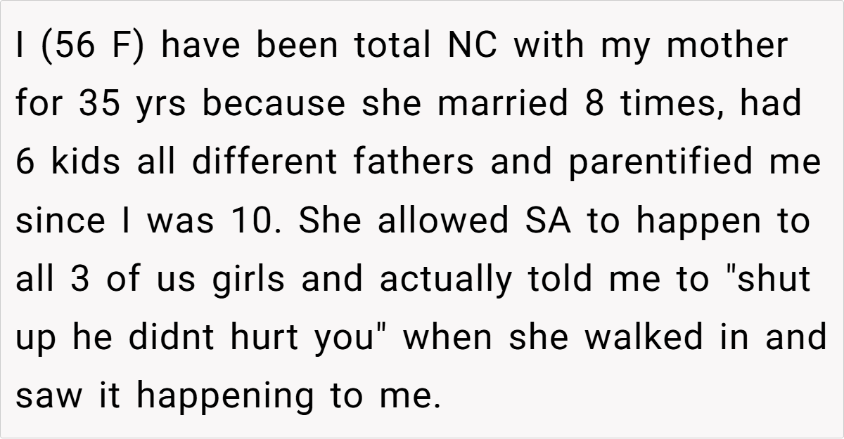 When decades of abuse and betrayal lead to a complete breakdown in a mother–daughter relationship, maintaining no contact can be a deeply personal and necessary decision. In this story, a 56‑year‑old woman explains why she has stayed completely NC (no contact) with her mother for 35 years—even as her mother ages and faces health issues.