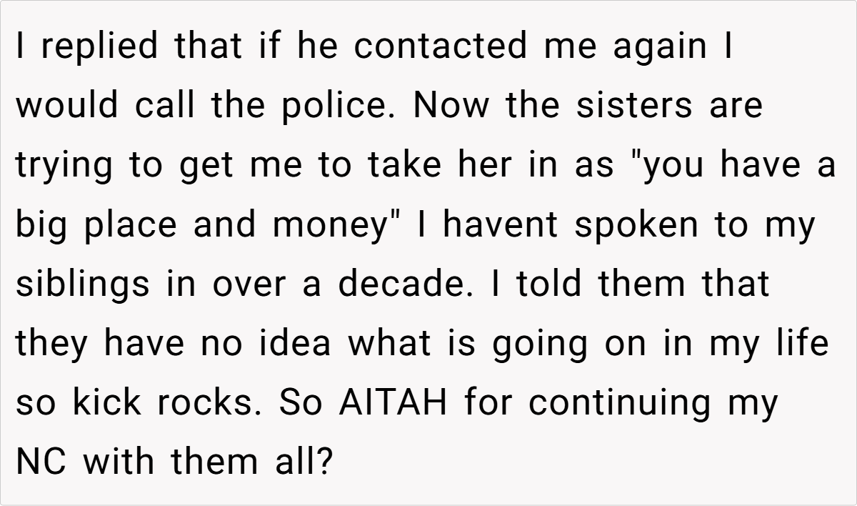 Now, with her estranged mother’s oldest daughter demanding financial help for her care and her siblings pressuring her to reintegrate, she remains firm in her boundaries. But is she the a**hole for refusing to speak with her mother after all these years?