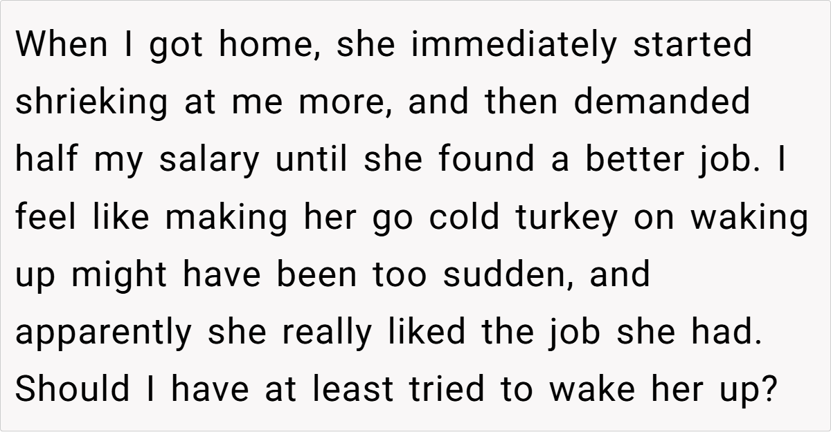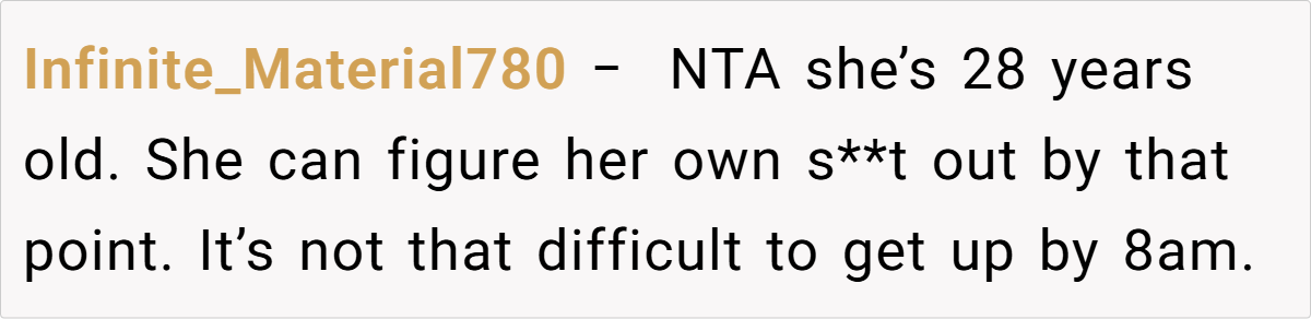 OP’s decision to stop waking her up can be seen as a last-ditch effort to reclaim some semblance of control. However, the fallout—her subsequent firing—demonstrates that unilateral decisions in partnerships often have unintended and far-reaching repercussions. This serves as a cautionary tale about the importance of negotiating everyday responsibilities rather than letting them become points of contention.