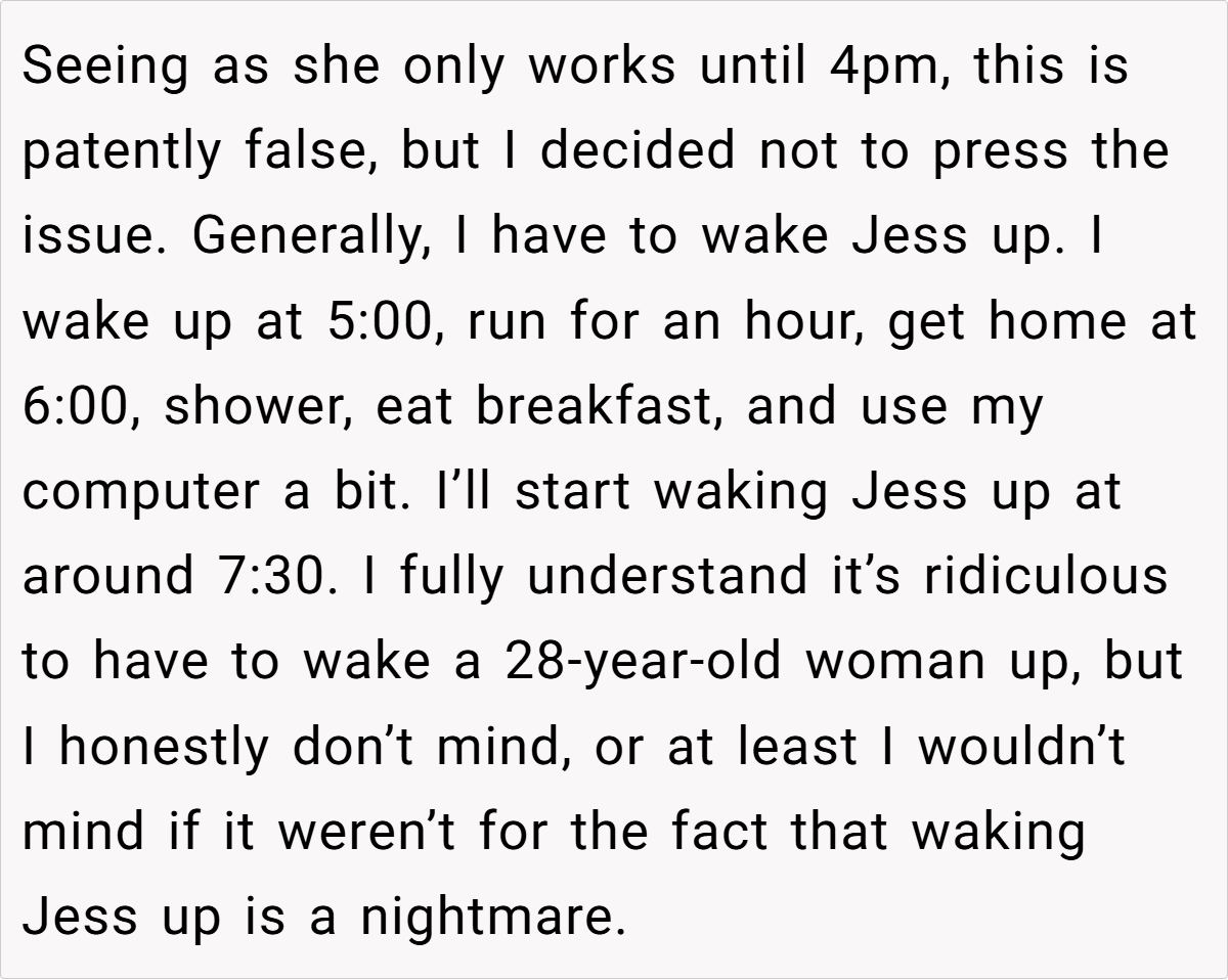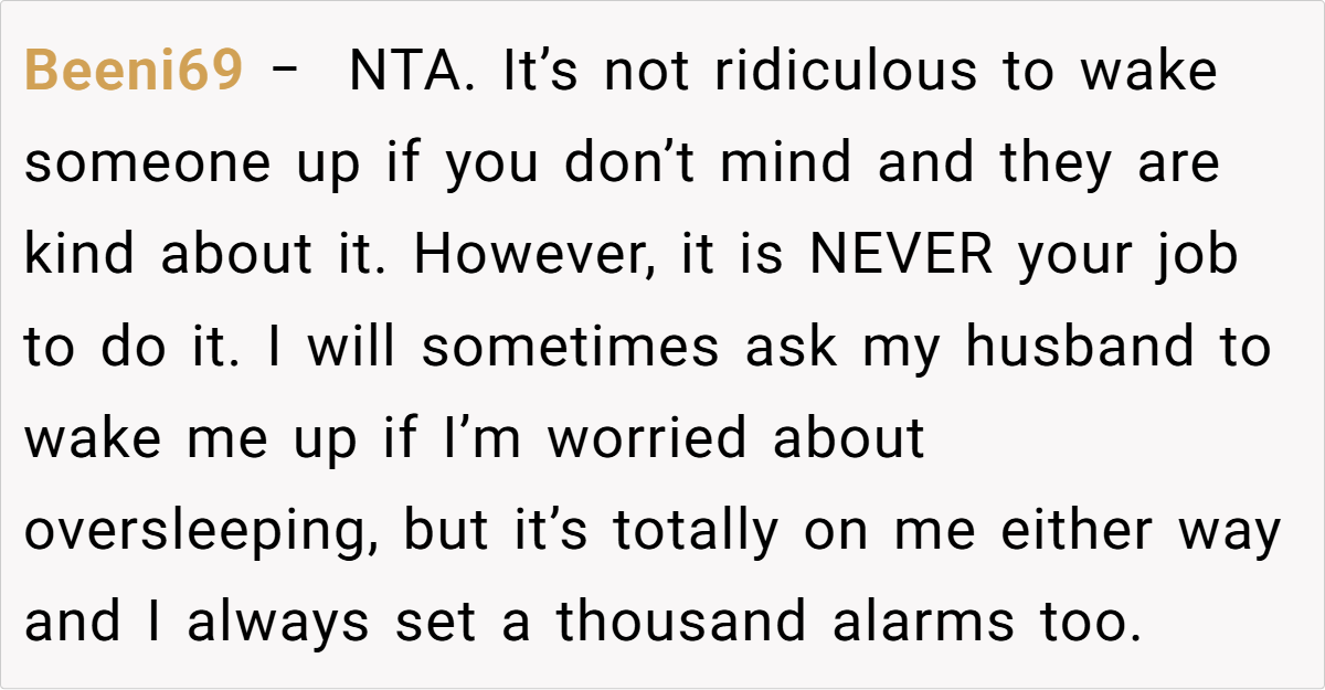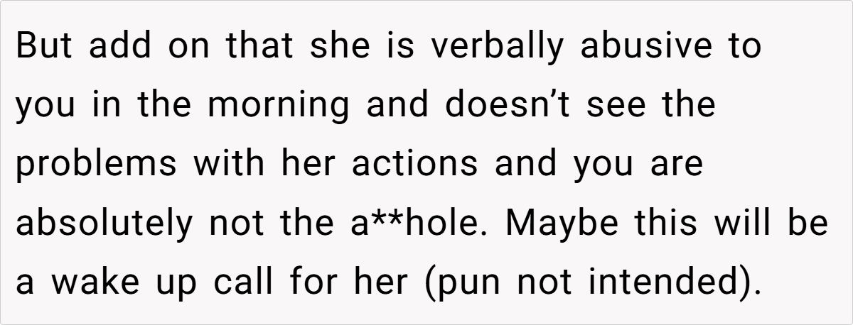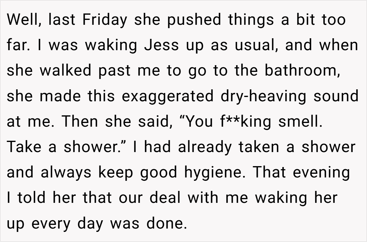 OP’s account paints a picture of a relationship strained by unmet expectations. What began as a simple, albeit inconvenient, duty of waking Jess eventually morphed into a daily irritant. Each morning, the effort to nudge her awake was met with insults and dismissals—a recurring cycle that slowly built up resentment. Such repetitive friction can lead to major relational fallout, as demonstrated when Jess’s oversleeping directly resulted in her losing her job.