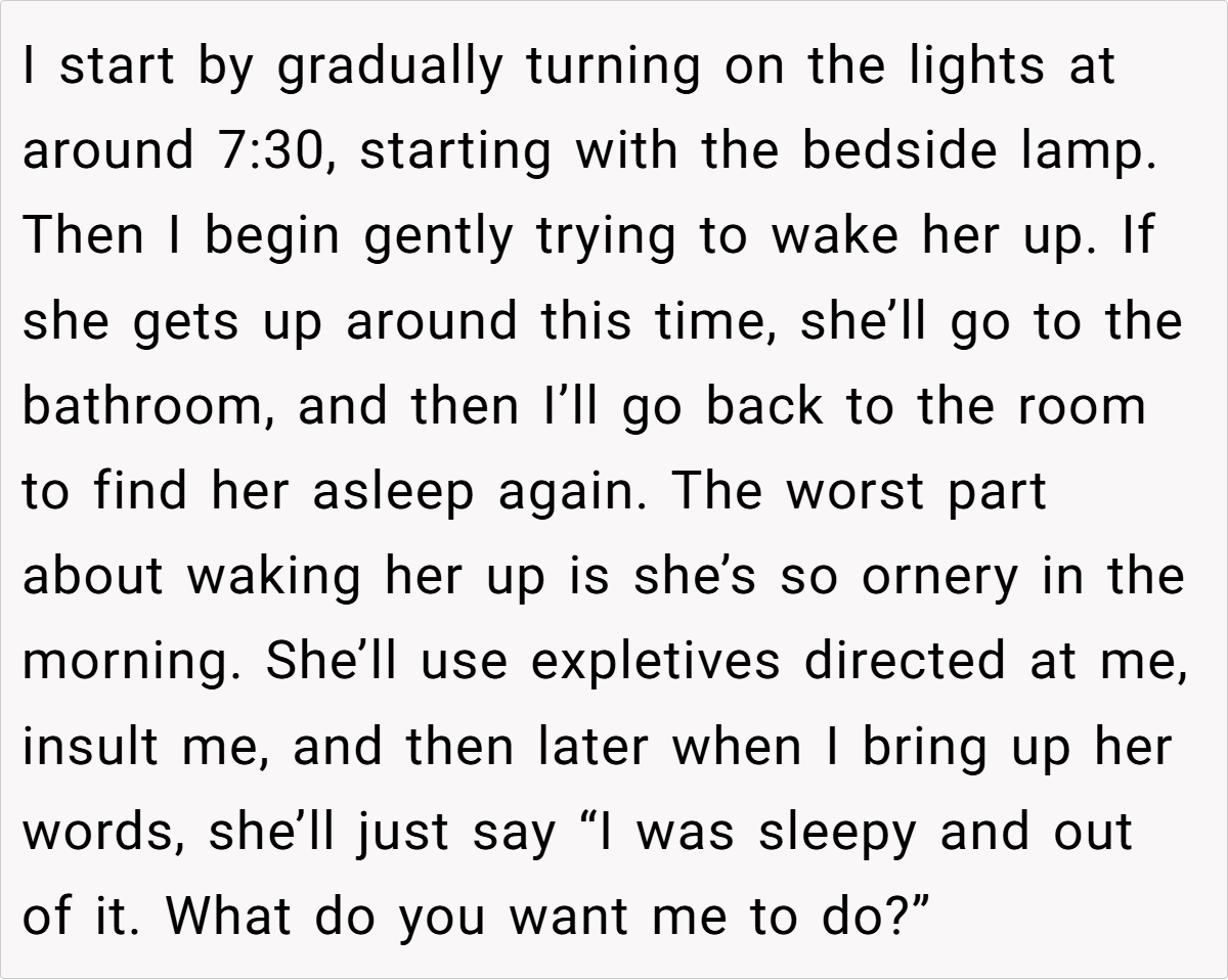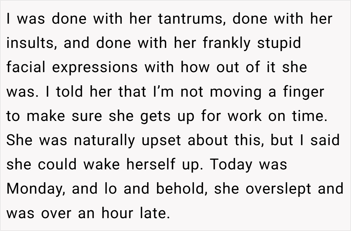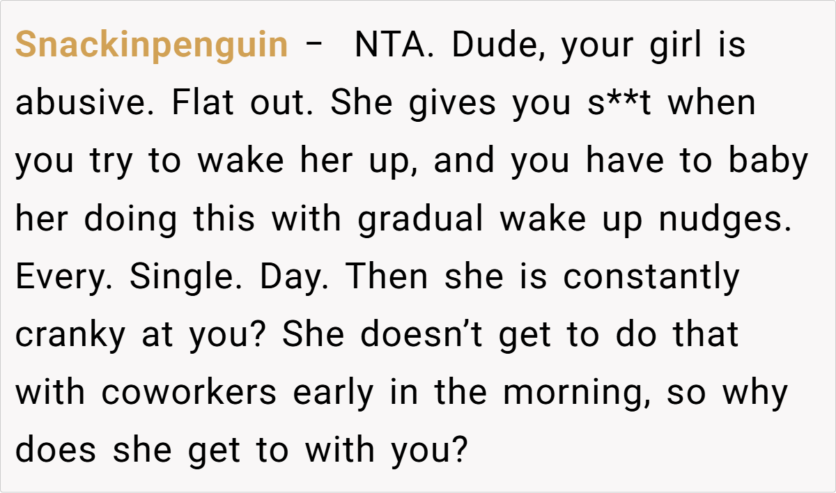 OP’s account paints a picture of a relationship strained by unmet expectations. What began as a simple, albeit inconvenient, duty of waking Jess eventually morphed into a daily irritant. Each morning, the effort to nudge her awake was met with insults and dismissals—a recurring cycle that slowly built up resentment. Such repetitive friction can lead to major relational fallout, as demonstrated when Jess’s oversleeping directly resulted in her losing her job.