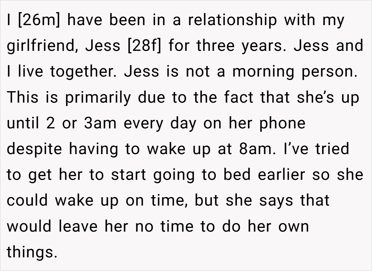 Jess, 28, is a self-professed night owl who spends her late hours absorbed in her phone, making early mornings a formidable challenge. While OP dutifully rises at 5:00 AM for his run and morning rituals, he’s left repeatedly chasing a reluctant partner who seems to exist in her own sleepy world. The friction escalated when his efforts to rouse her became a source of constant irritation—until one morning, everything came crashing down.