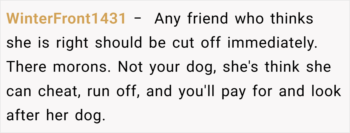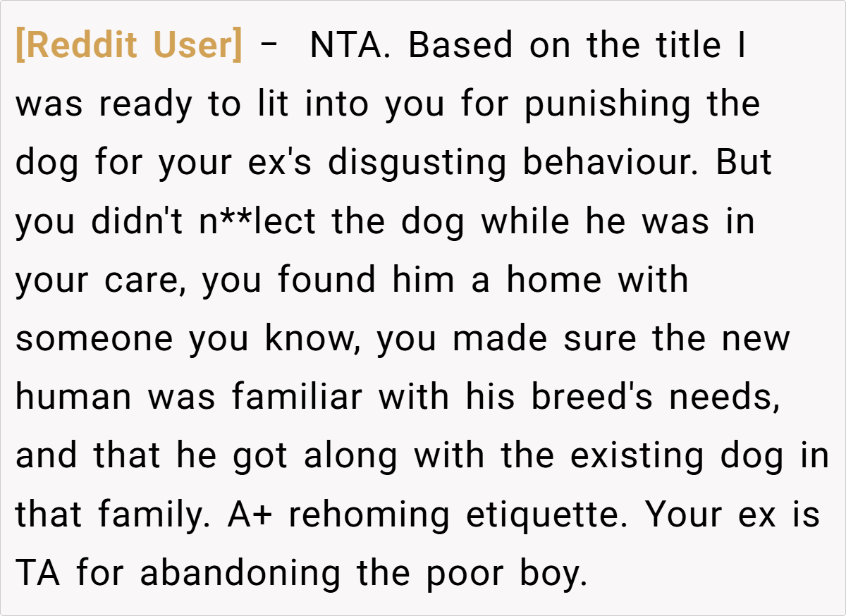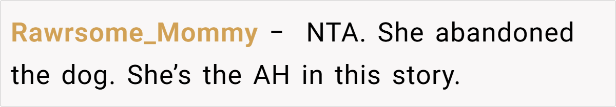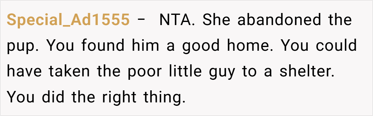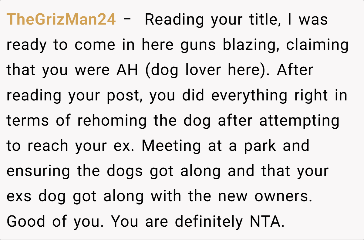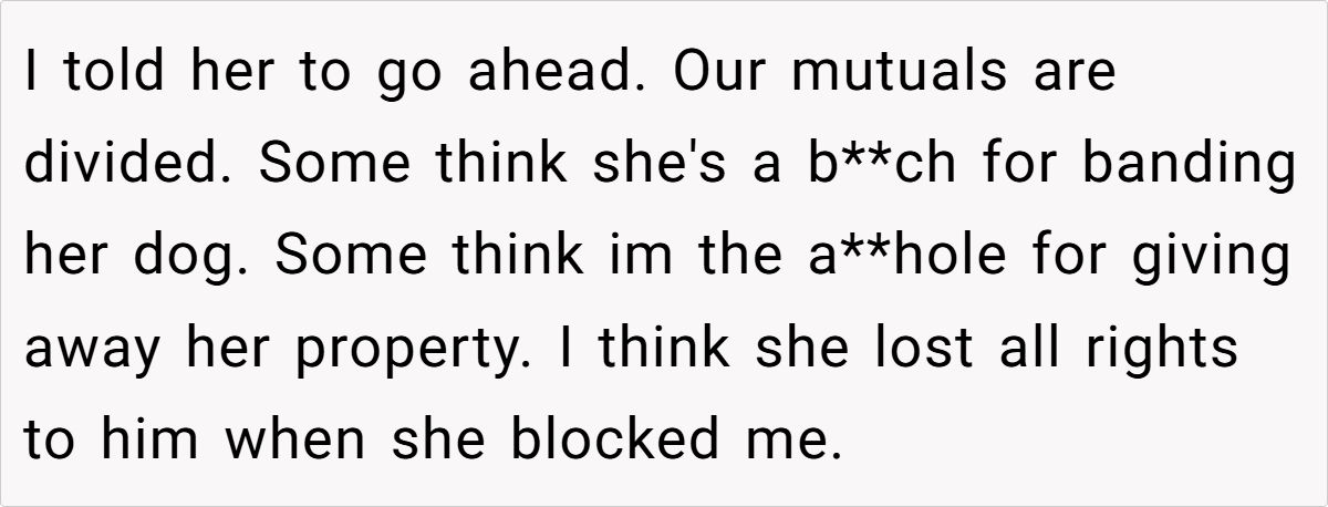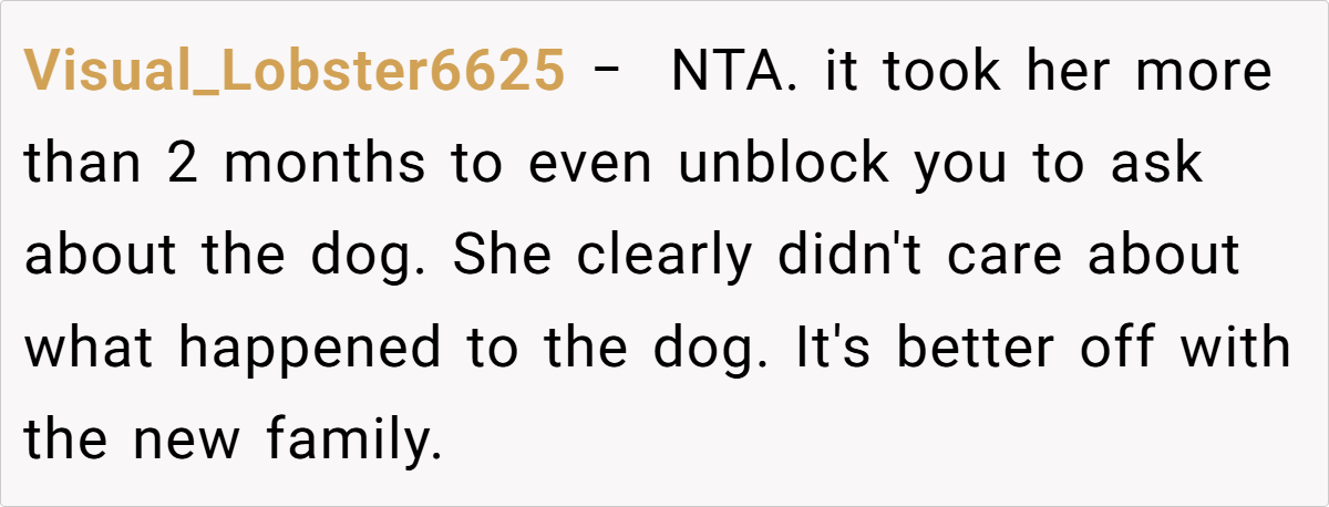 Across the board, many community members express strong support for the caregiver’s decision to rehome the dog. A prevalent sentiment is that the ex’s deliberate avoidance—blocking communication and failing to arrange for the pet—amounts to abandonment. This perspective holds that once an owner neglects their duty, the caregiver who steps in not only provides necessary care but also gains a rightful claim to the pet.