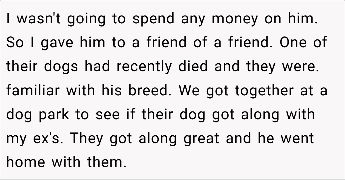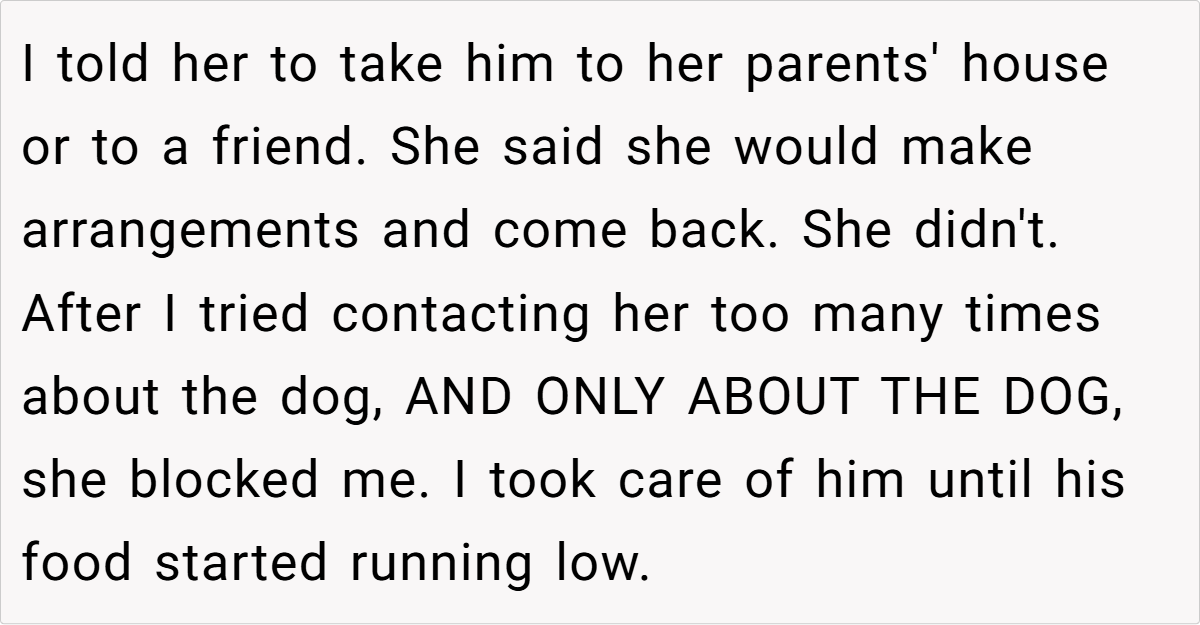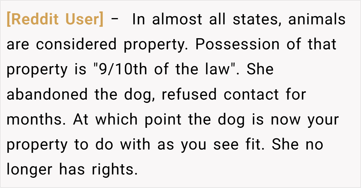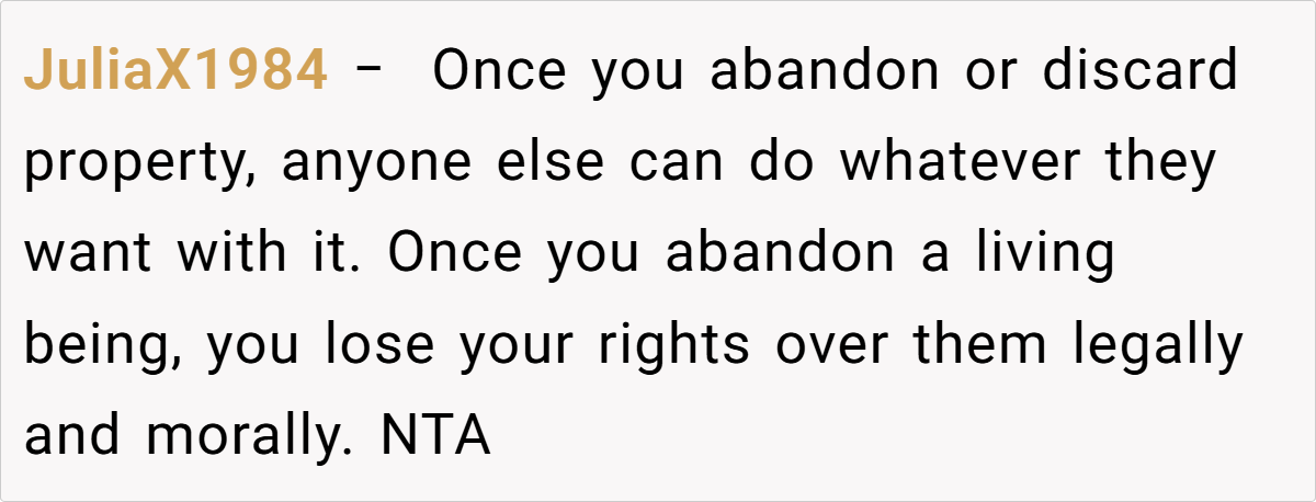 Letting go of a pet can sometimes mean relinquishing legal rights. According to Justia, “animals are legally considered property in most jurisdictions, and abandonment effectively nullifies an owner’s claim,” meaning that if an owner refuses to reclaim their pet, any subsequent caregiver may assume full control. This perspective underscores that, from a legal standpoint, the man’s decision to rehome the dog was justified once his ex effectively abandoned her responsibilities.