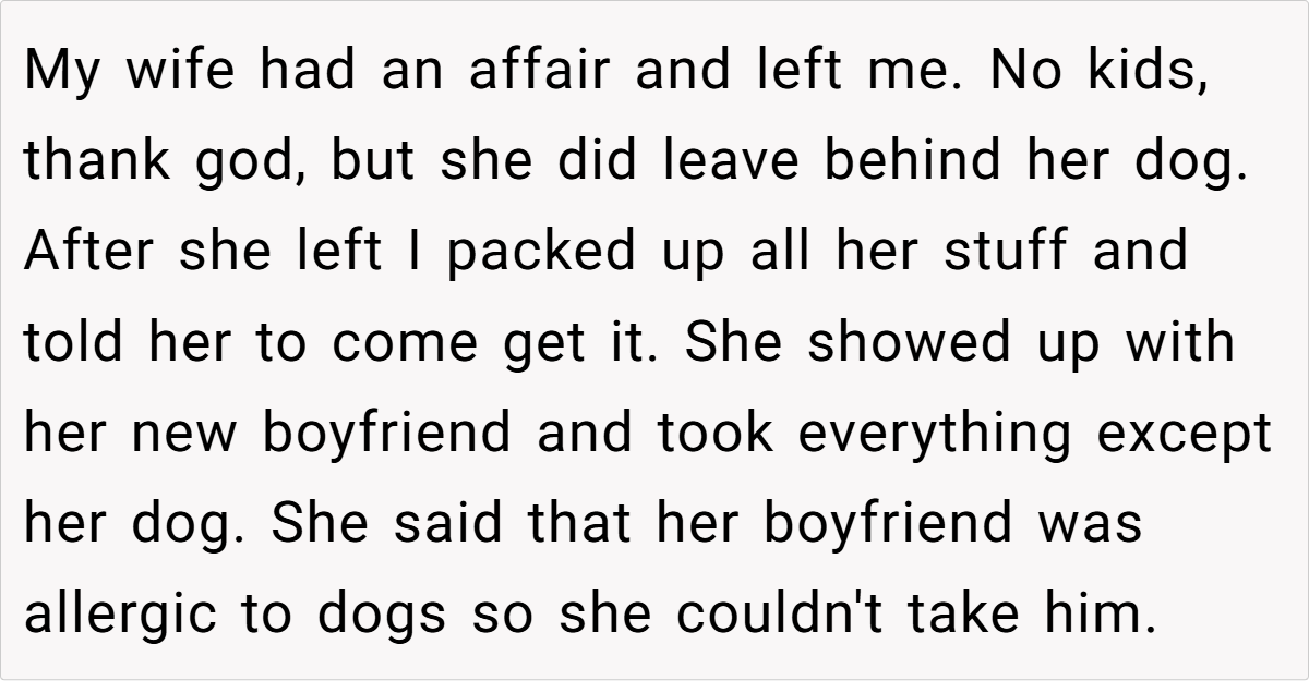 In a twist of modern relationship drama, one man finds himself entangled in a dispute not over family or finances—but over a dog. When his wife left him after an affair, she took everything except her pet. What started as a practical decision to care for the dog evolved into a legal and moral battle over ownership.