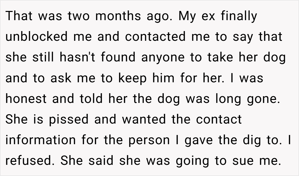 The narrative paints a vivid picture of personal betrayal and the unexpected complexities of pet custody. The man, who stepped up when his ex abandoned the dog, ultimately rehomed the pet with a friend. When his ex resurfaced demanding the dog’s return, the disagreement escalated into a potential lawsuit. This story forces us to consider: when does caring for a pet become a rightful claim to ownership, and what does abandonment really mean in the eyes of the law?