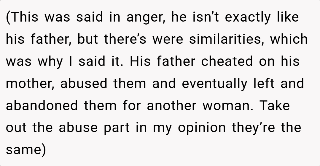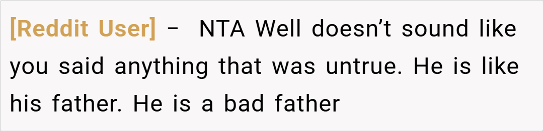 Many redditors empathize with the OP, stating that if your partner continuously cancels on your child, you’re justified in calling him out for his neglect. “When you’re repeatedly let down by someone who promises to be there, comparing him to someone who abandoned his family isn’t far-fetched,” one commenter remarked, highlighting the emotional toll of abandonment.