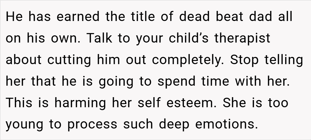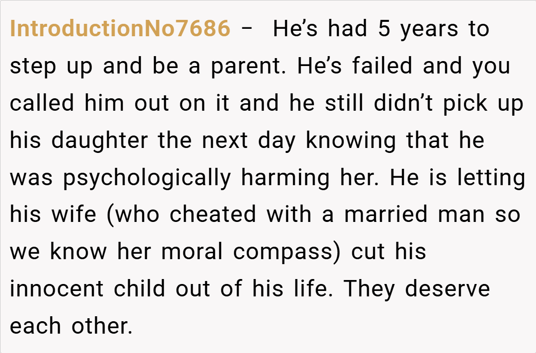 The expression of that pain, while harsh, is often a reflection of years of unmet needs.” (kidshealth.org) In this case, the OP’s ex-husband had consistently failed to be there for their daughter, despite promising to show up. Such repeated cancellations naturally led to feelings of abandonment, making the comparison to his own father—a figure associated with neglect and betrayal—a poignant, if painful, reflection of his behavior.