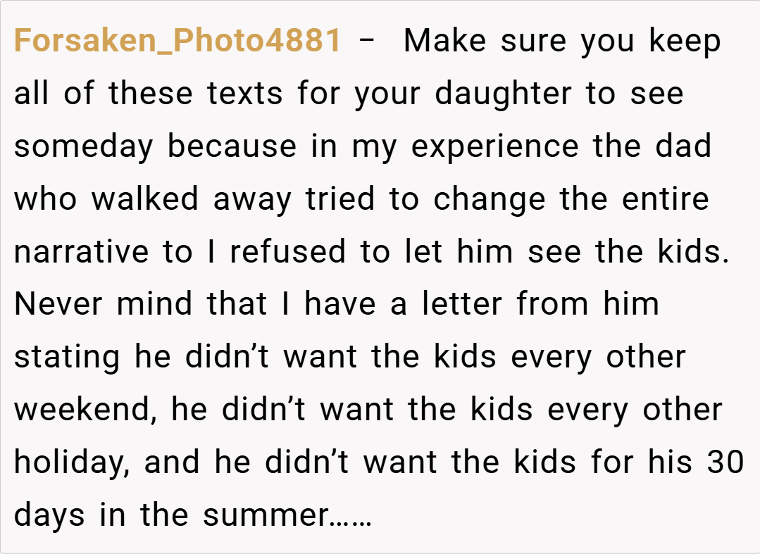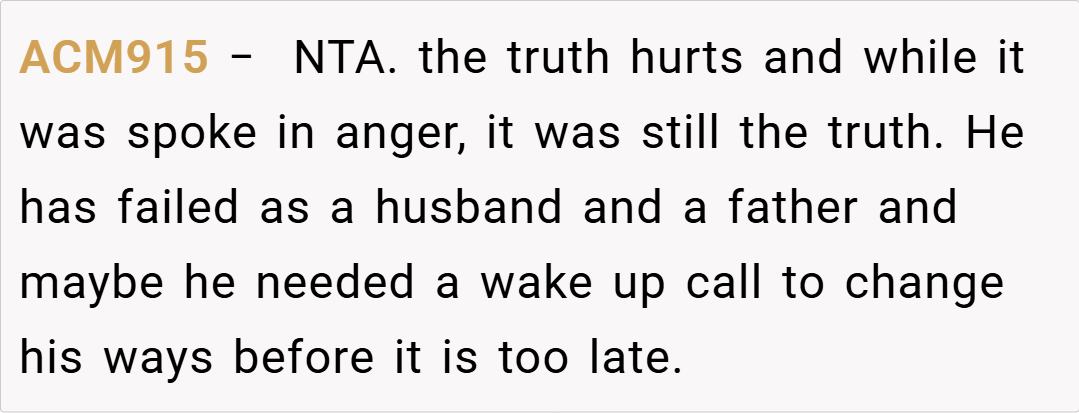 Family therapist Dr. Susan Johnson adds, “In situations where a child is repeatedly disappointed by a parent’s inaction, the emotional toll on the entire family is significant. A parent who prioritizes personal convenience over a child’s well-being risks not only the child’s trust but also the stability of the family unit.” Her perspective underscores that the OP’s outburst wasn’t a spur-of-the-moment insult but rather the culmination of years of emotional neglect.