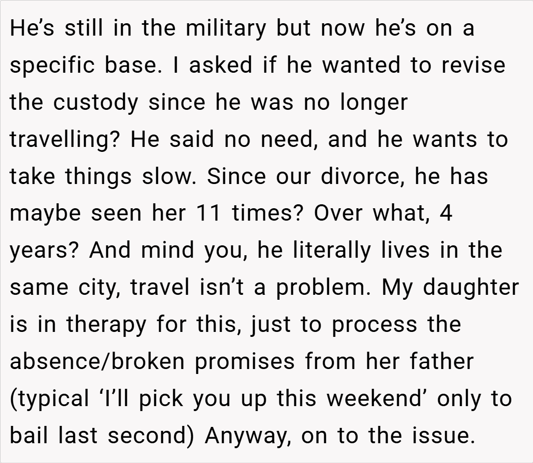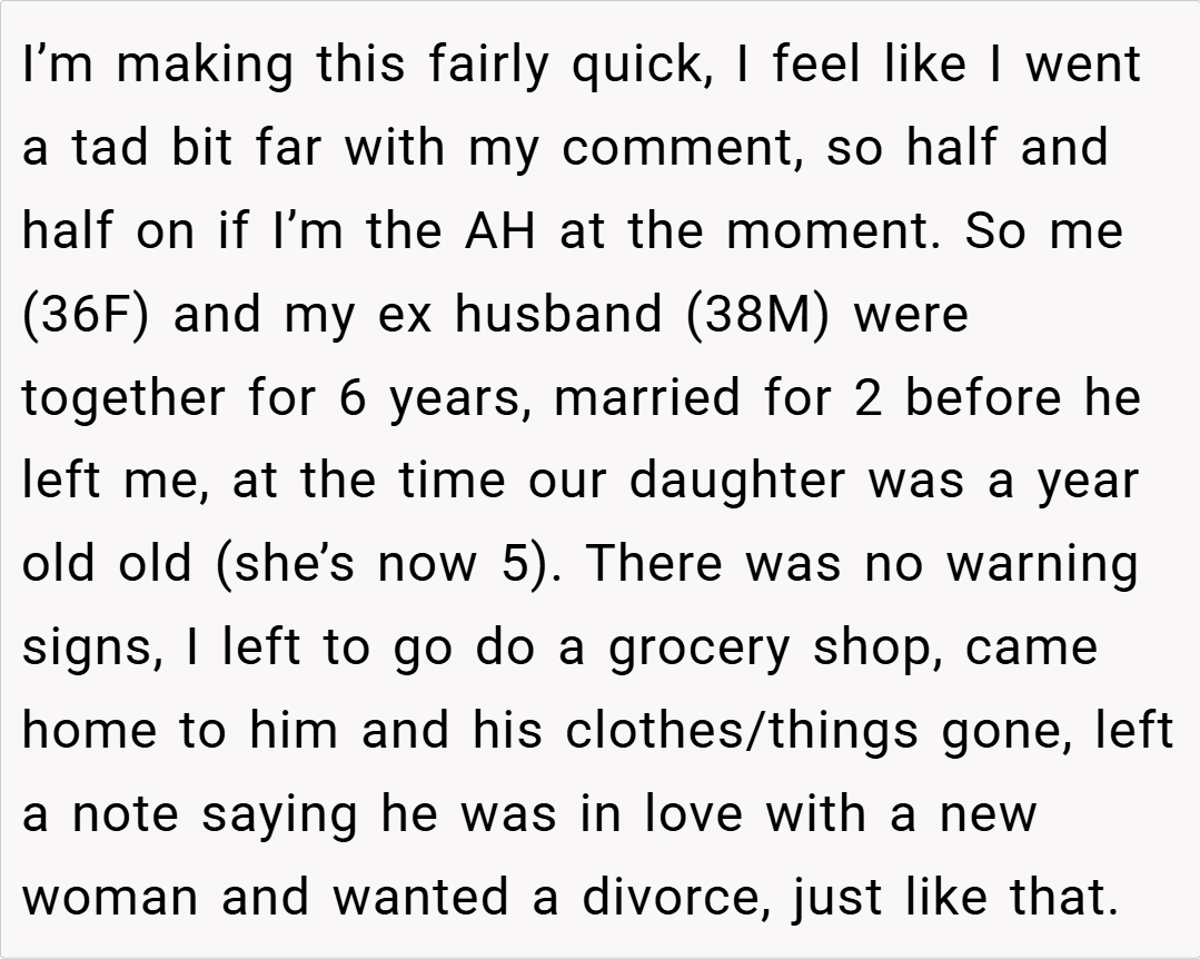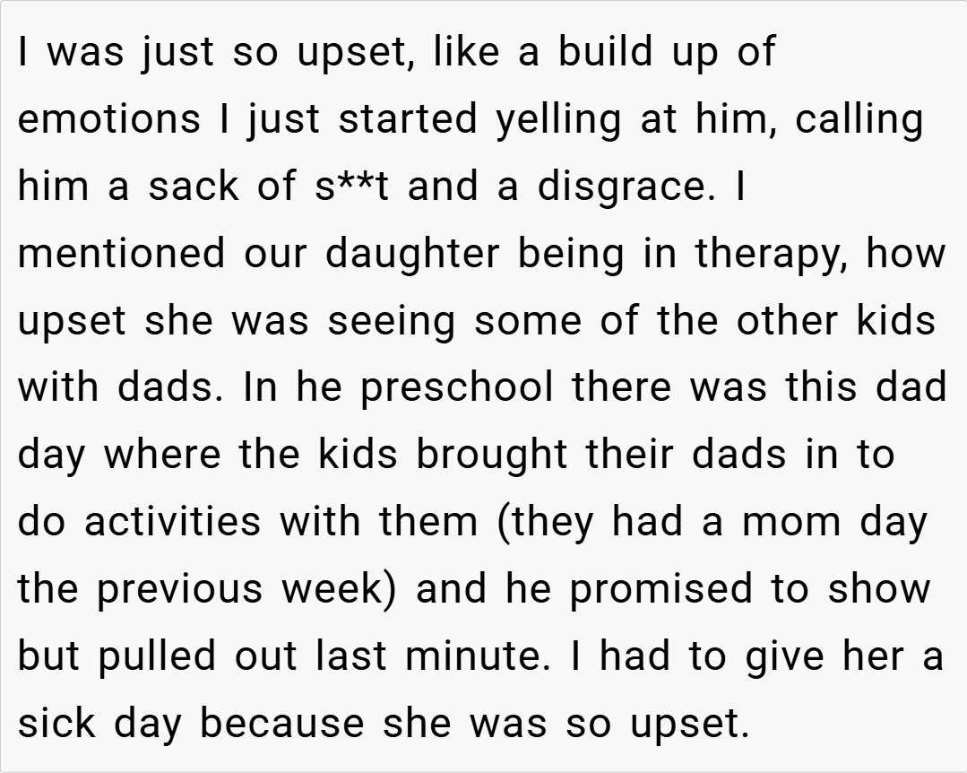 they inevitably come to the surface in moments of crisis. The OP’s declaration is a manifestation of deep-seated hurt and a desperate plea for her ex-husband to recognize the impact of his neglect on their daughter. Though it may have been harsh, it served as a long-awaited, unfiltered expression of pain that has been building over years of broken promises and missed opportunities.