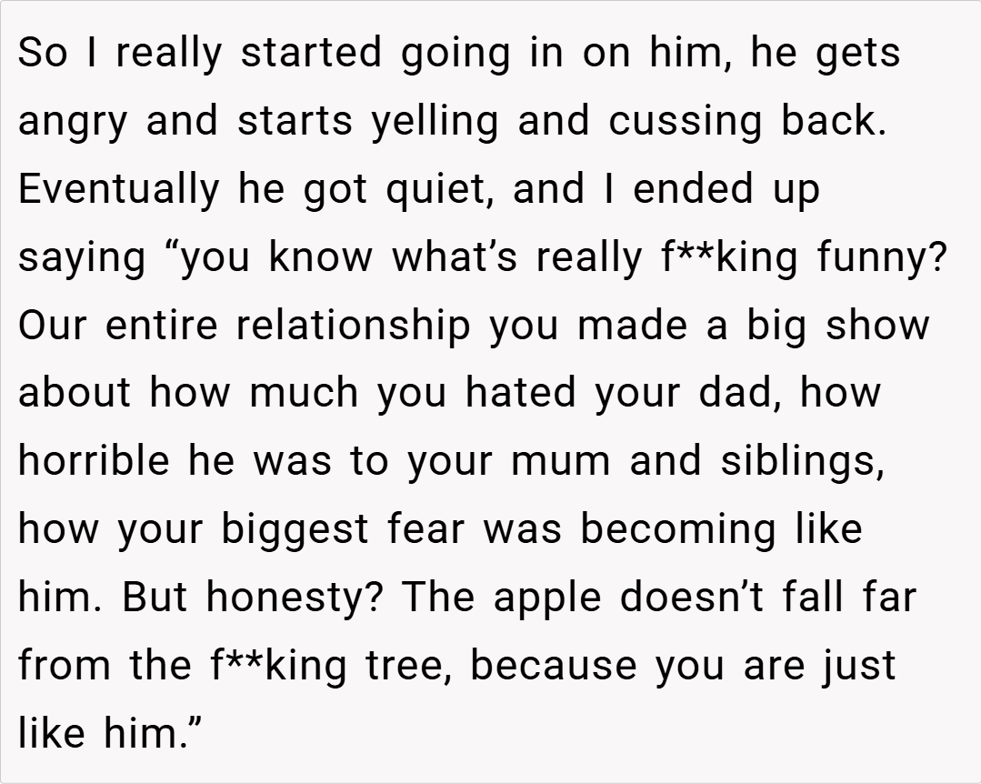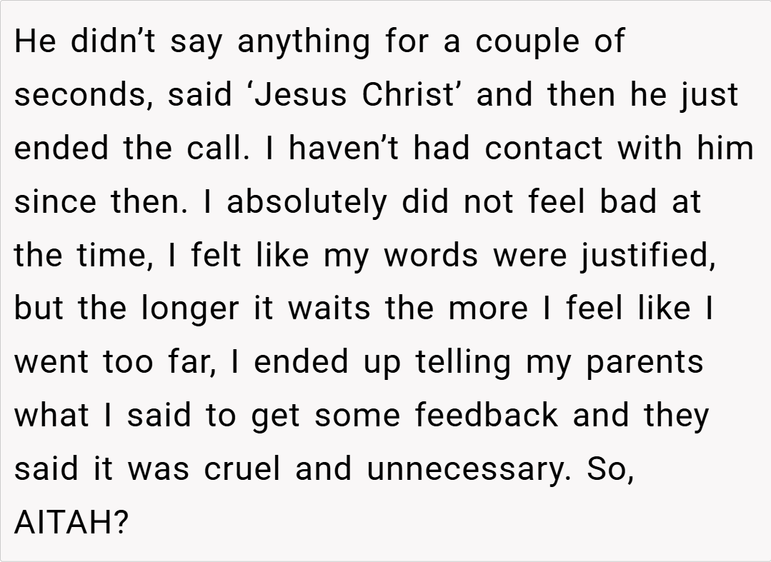 Is it ever justified to use such strong language as a wake-up call, or does it risk burning bridges that might otherwise be repaired? What would you do if you found yourself in a similar situation, with years of neglect coming to a head in a single explosive moment? Share your thoughts and experiences in the comments below—what would you do if you were in the OP’s shoes?