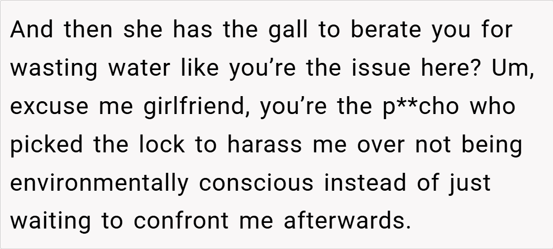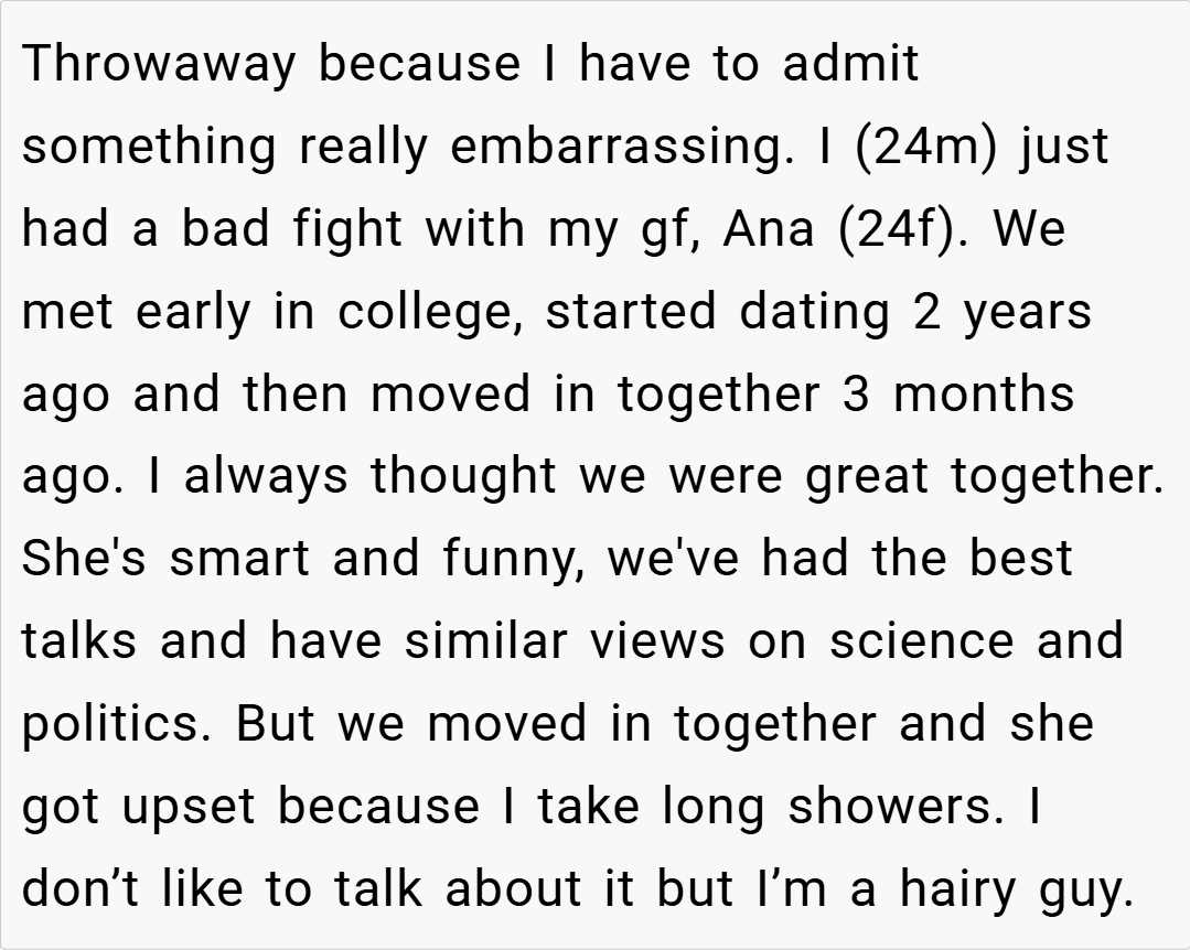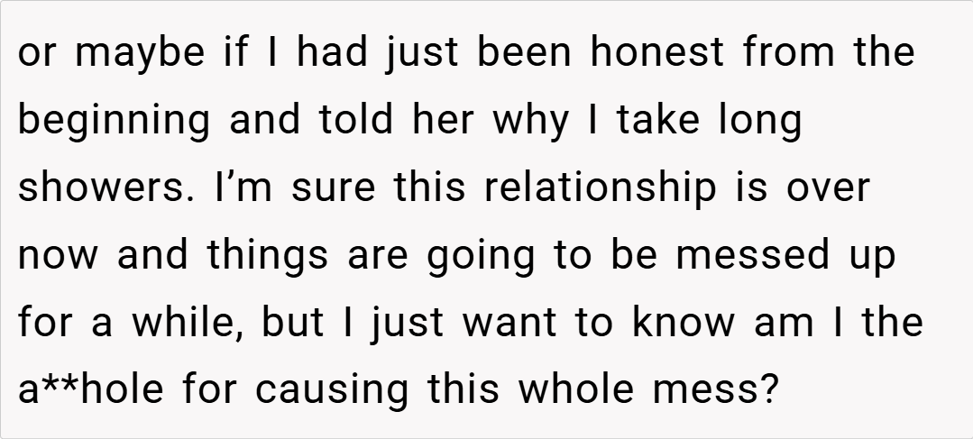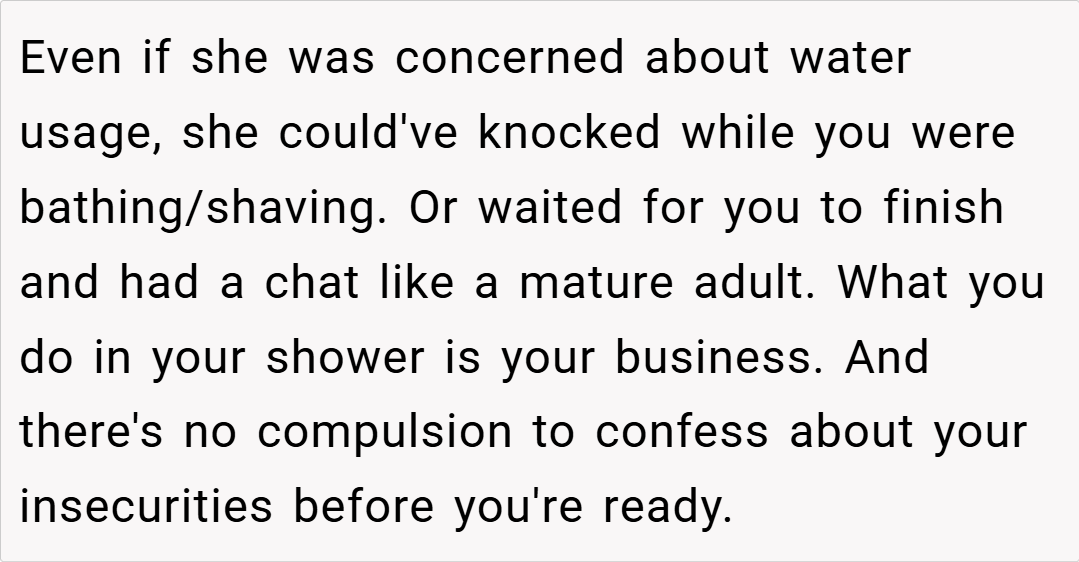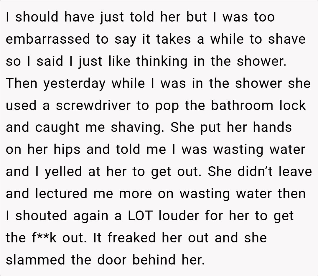 As someone who’s already self-conscious about taking long showers to properly shave his body, he was caught completely off guard. In the heat of the moment, he yelled for her to “get the f**king out,” an outburst that left her frightened and deeply upset. Now, as he reflects on the incident, he’s left wondering if his reaction was justified or if he overstepped a line in his relationship.