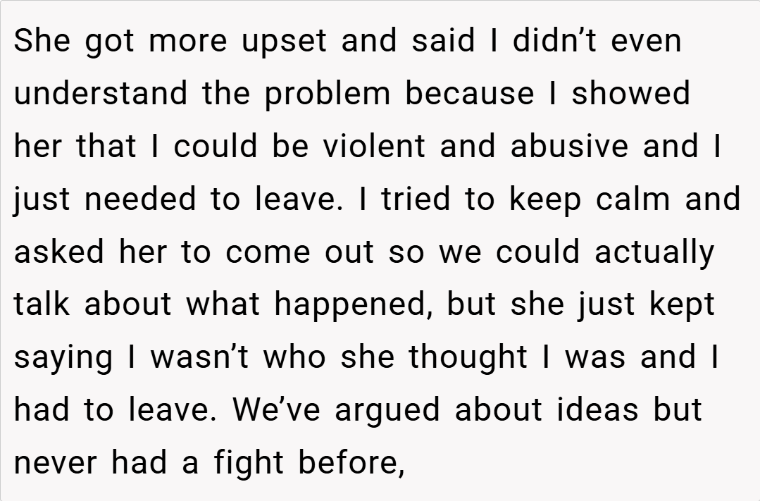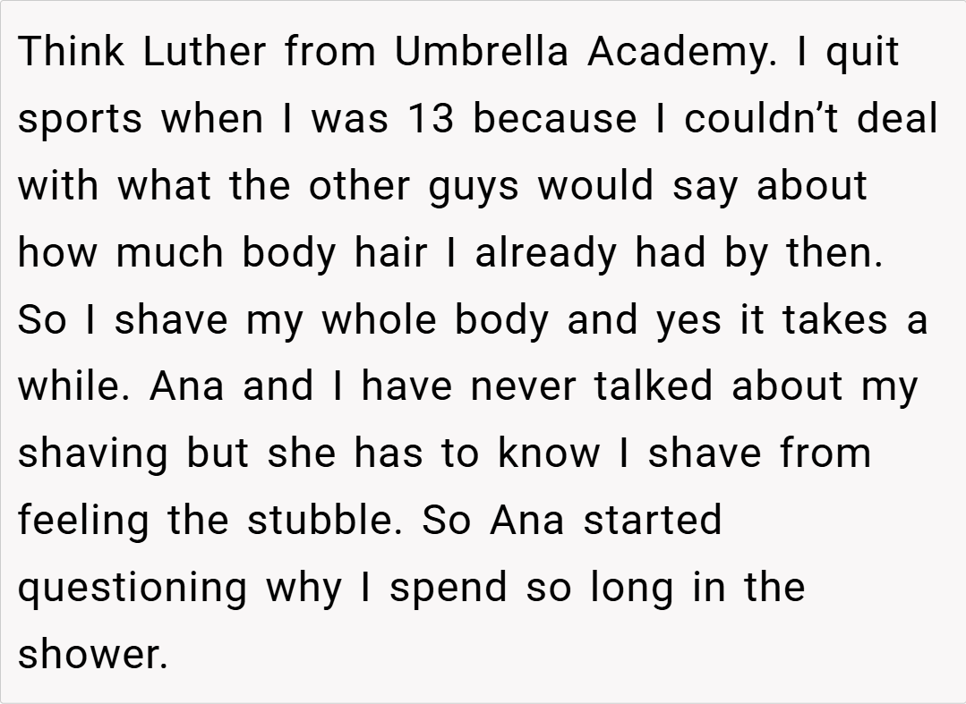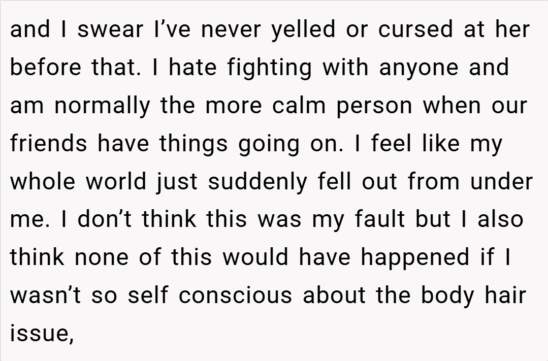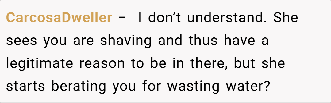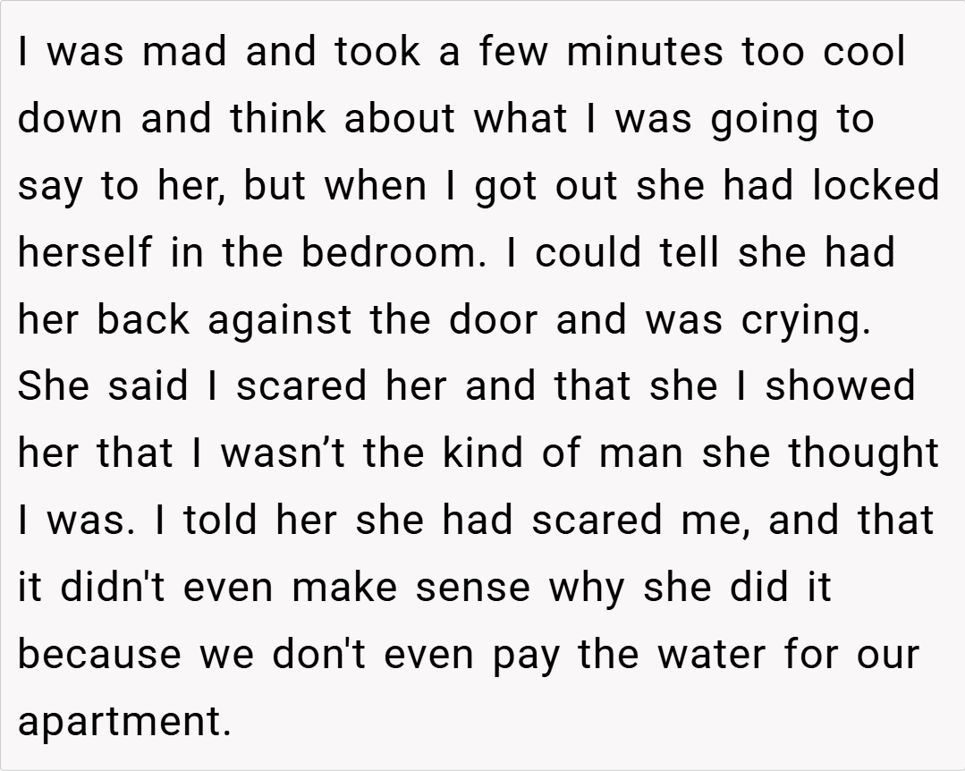 As someone who’s already self-conscious about taking long showers to properly shave his body, he was caught completely off guard. In the heat of the moment, he yelled for her to “get the f**king out,” an outburst that left her frightened and deeply upset. Now, as he reflects on the incident, he’s left wondering if his reaction was justified or if he overstepped a line in his relationship.