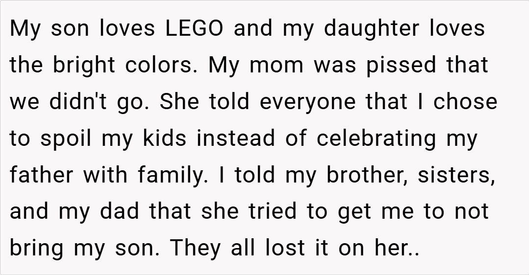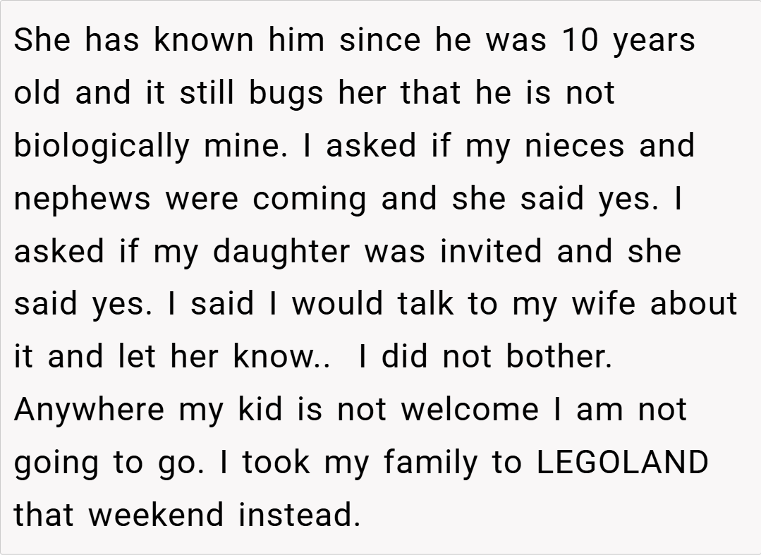 He claims, always try to manipulate his personal decisions—he chose to skip the party altogether and take his family to LEGOLAND instead. Now, with backlash from his extended family labeling him as heartless, he wonders if he’s the asshole for drawing a firm boundary about who gets to share in his celebrations.