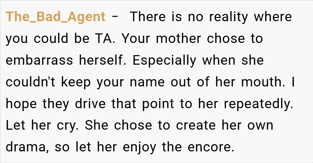 If one person’s feelings continuously infringe on your right to build a life on your own terms, setting boundaries is not only justified but necessary.” The OP’s decision to skip the retirement party in protest of his mom’s exclusionary demands reflects his commitment to maintaining his personal integrity. Rather than bending to external pressures, he chooses to honor his hard work and his right to determine who shares in his celebrations.
