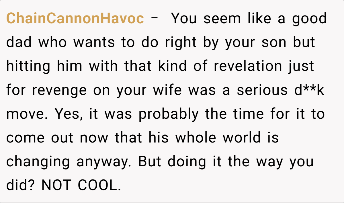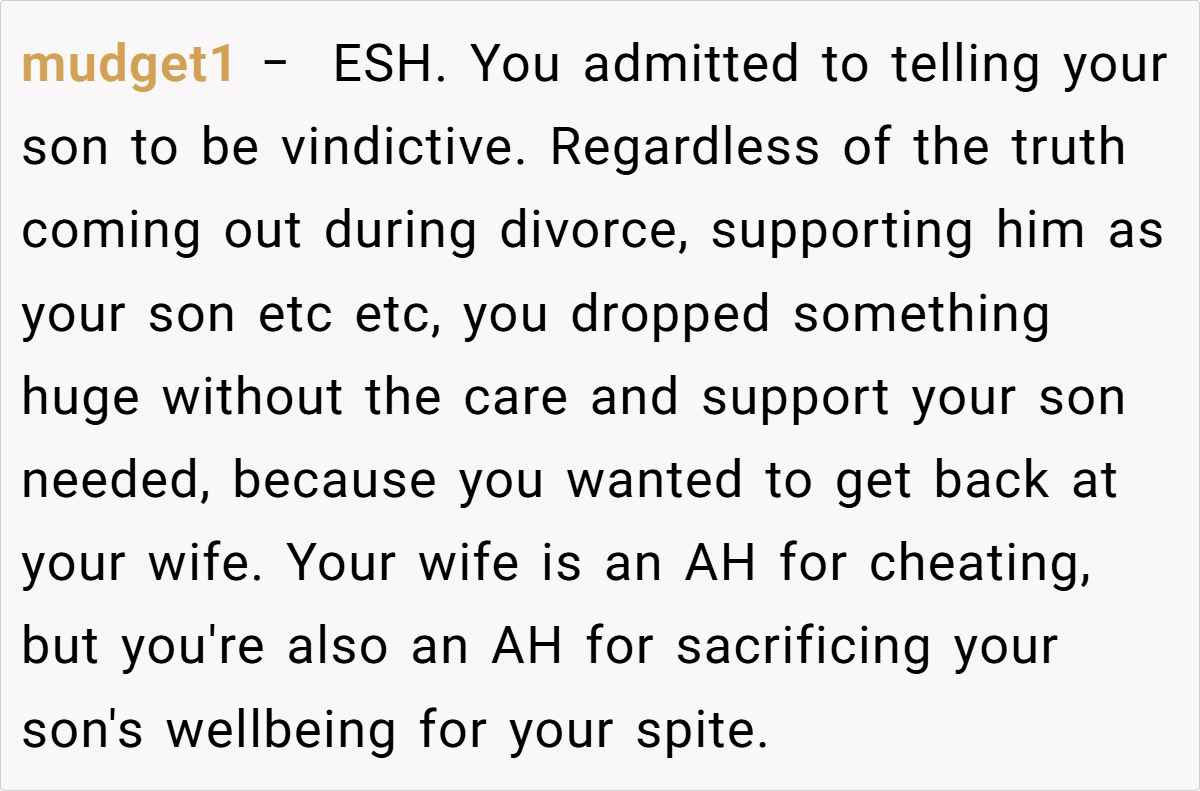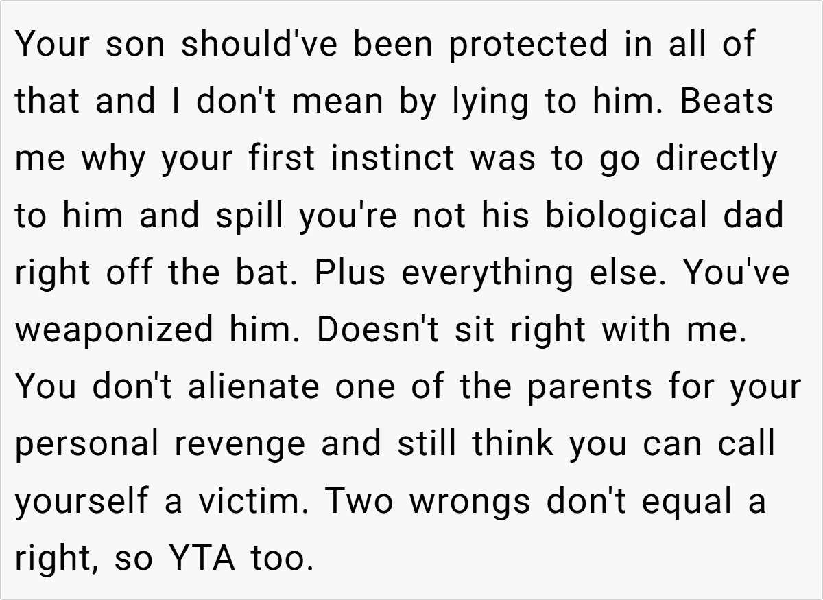 They emphasize that exposing the son to these adult issues in such a harsh manner can leave him confused, hurt, and caught in the middle of the conflict. Overall, the consensus is that the child should have been shielded from this information, and that both parents should prioritize the son’s emotional well-being over using family secrets as leverage in a custody battle.