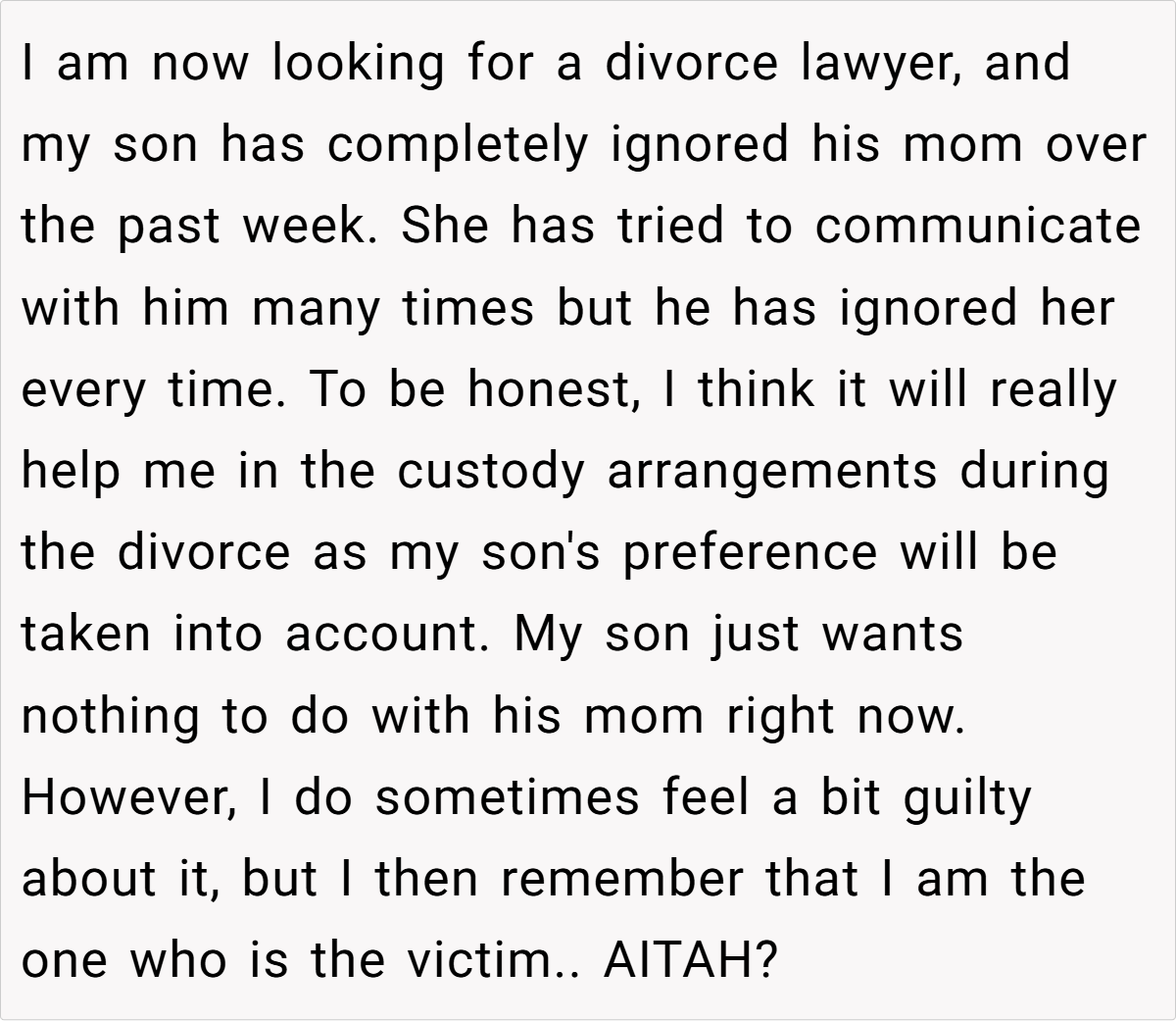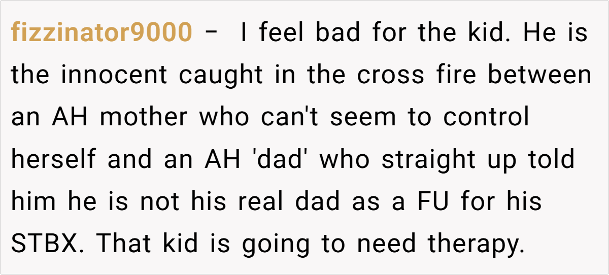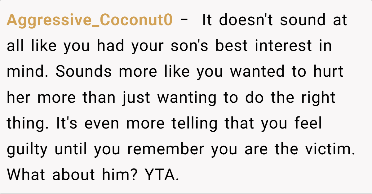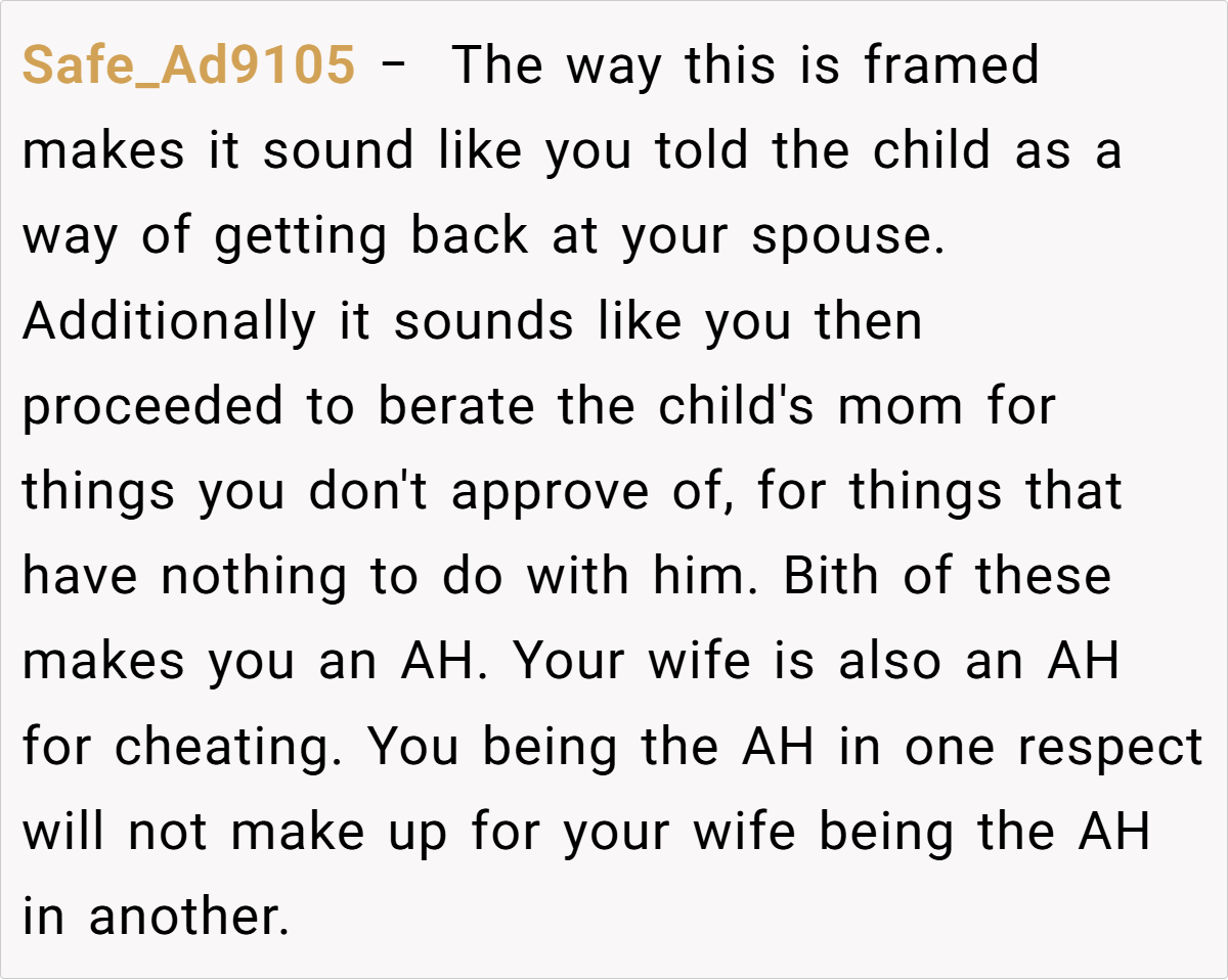 They emphasize that exposing the son to these adult issues in such a harsh manner can leave him confused, hurt, and caught in the middle of the conflict. Overall, the consensus is that the child should have been shielded from this information, and that both parents should prioritize the son’s emotional well-being over using family secrets as leverage in a custody battle.