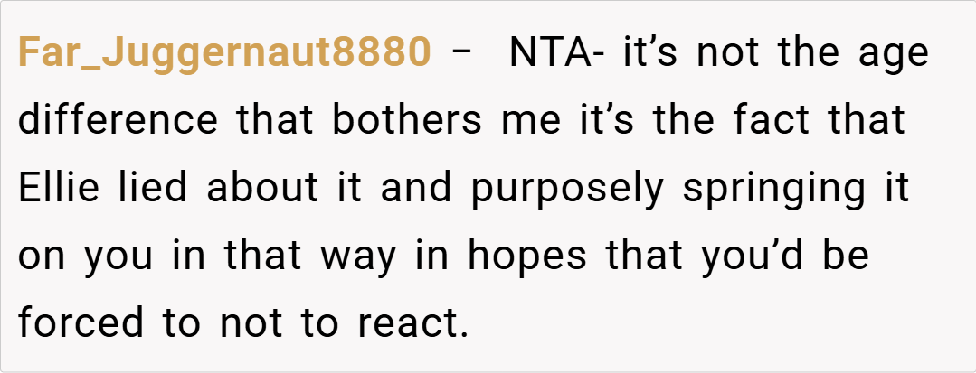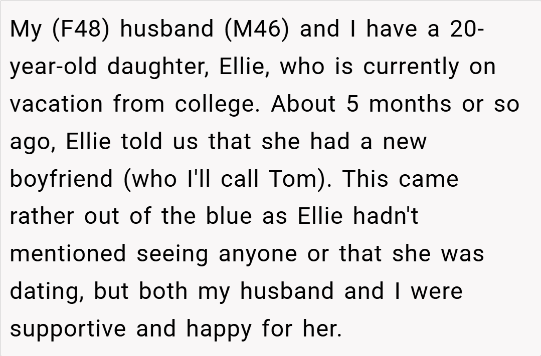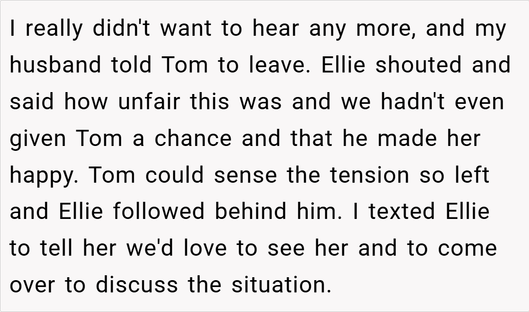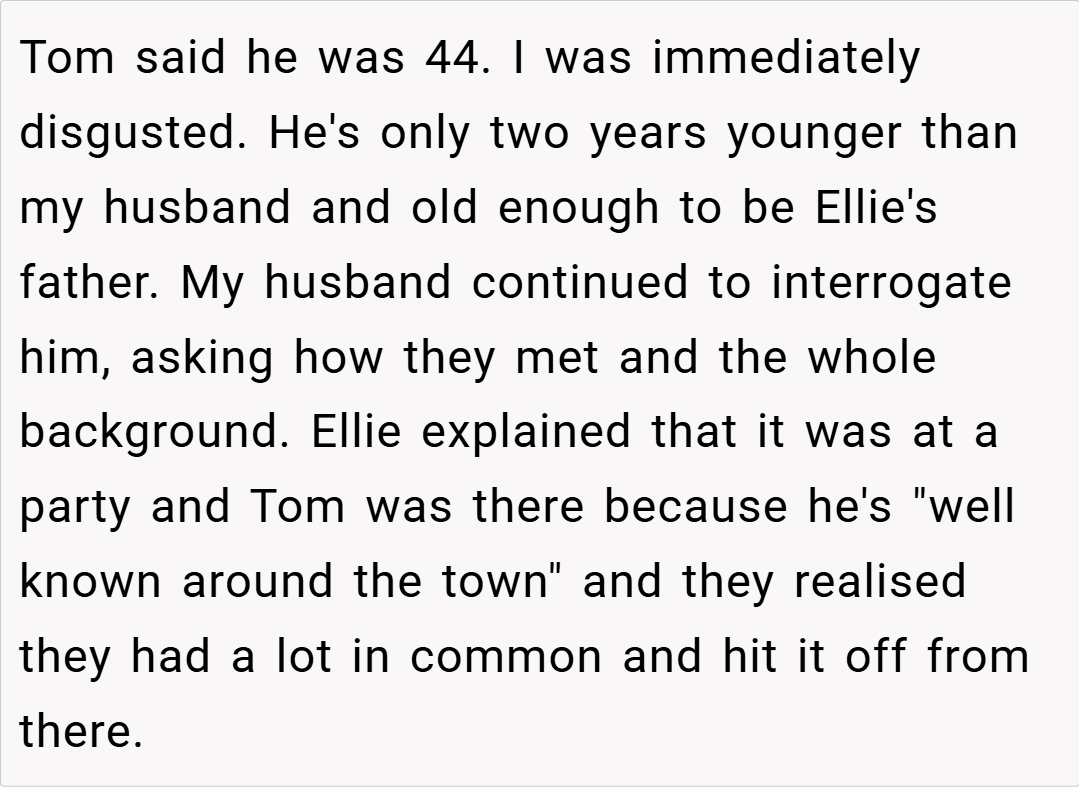 The shock of realizing that Tom is nearly as old as her own husband left the OP feeling betrayed by the unexpected revelation. Determined to protect her daughter from what she saw as a potentially unhealthy influence, she outright banned Tom from their home. Her decision has sparked strong reactions from her family—and even from Ellie—leaving her to wonder if she’s being overly judgmental or simply protecting what matters most.