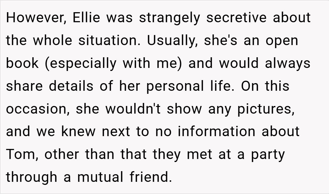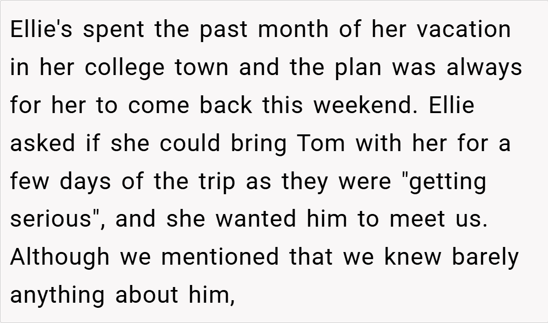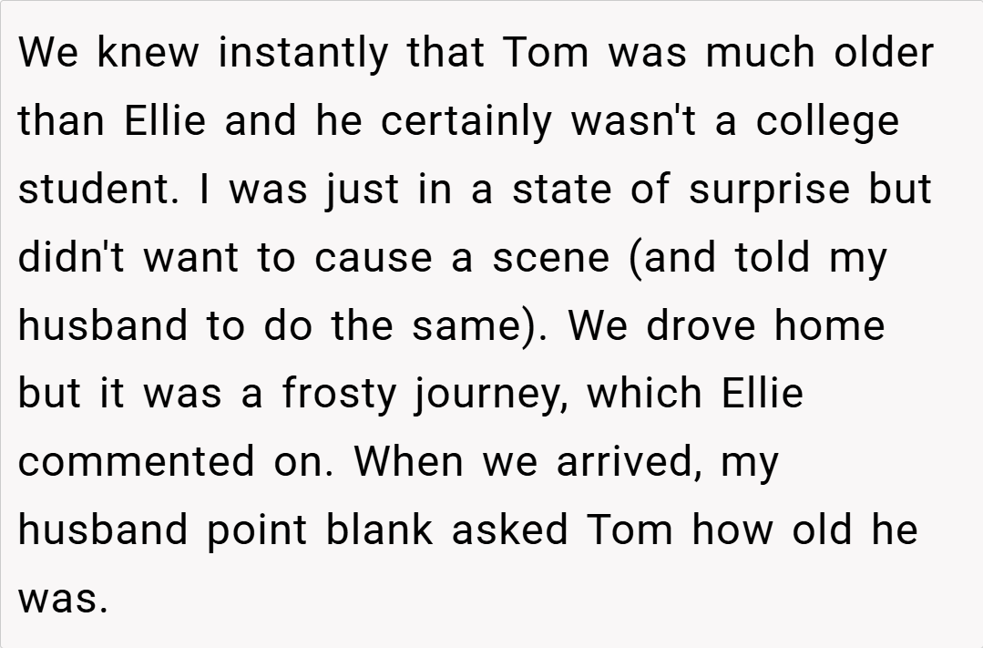 Having always been an open book, Ellie’s secretive approach about her relationship raised alarms when her parents discovered that her boyfriend, Tom, was much older than they had ever imagined. What began as a hopeful welcome for a new relationship quickly escalated into a full-blown dispute, leaving everyone reeling and family ties strained.