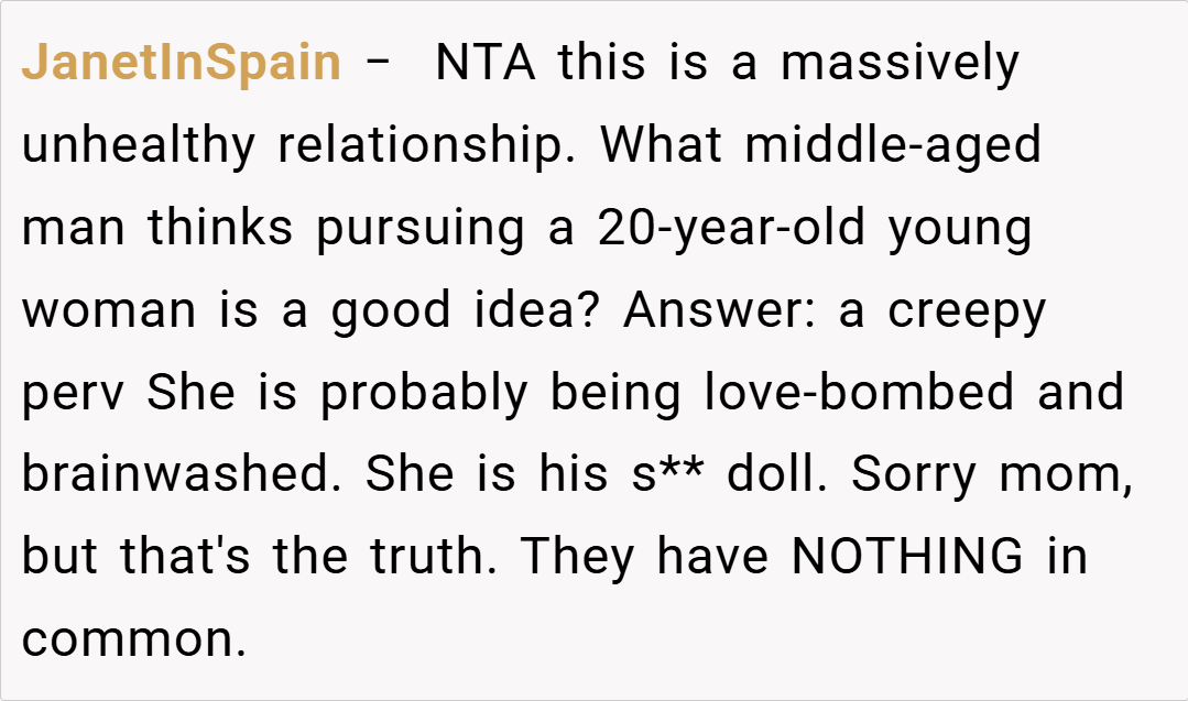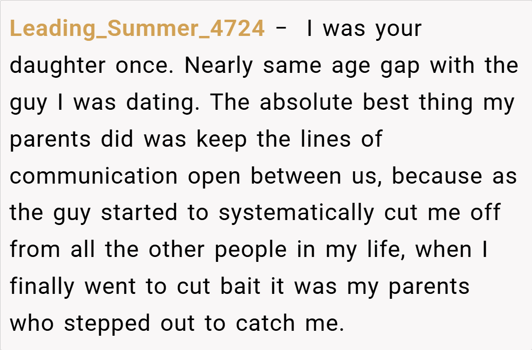 In this instance, the OP’s shock isn’t just about the age difference—it’s about the perceived mismatch in maturity and the potential influence of someone nearly her own husband’s age on her daughter. Dr. Durvasula further notes, “Parents often set boundaries based on their vision of a healthy relationship for their children.