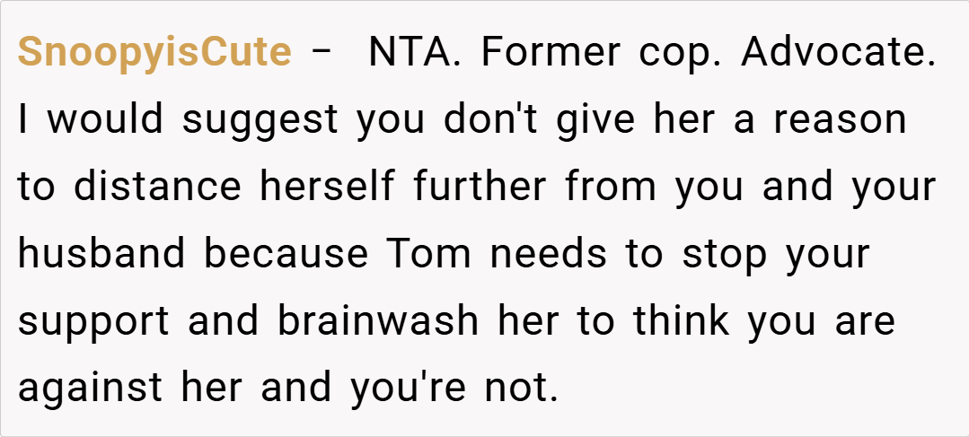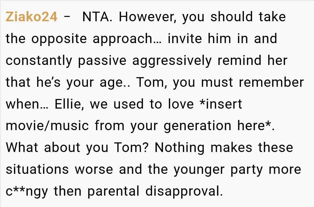 Many redditors sympathize with the OP’s protective instincts, arguing that her reaction is understandable given the significant age gap between Ellie and Tom. They stress that when a parent feels that a partner may be more of a father figure than a boyfriend, it’s natural to push back. “If you’re raising a 20-year-old, you need someone who’s more relatable—not someone who’s almost your age,” one redditor commented.