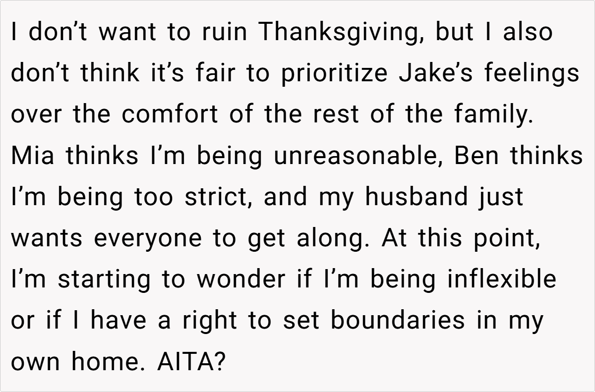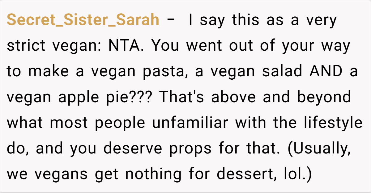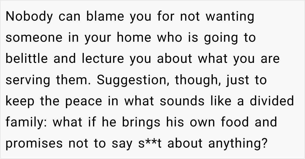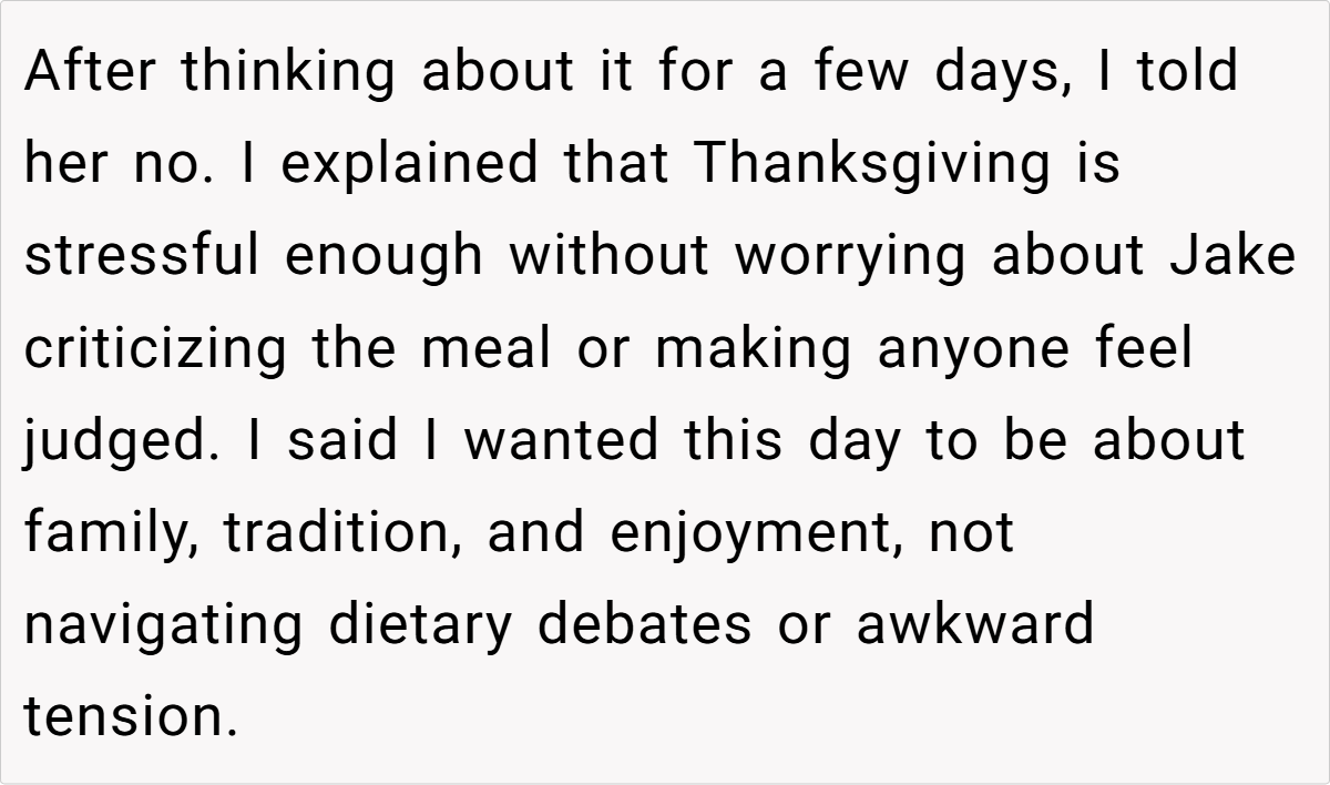 Some even suggested compromise measures—such as allowing Jake to bring his own food or enforcing a strict rule that any negative comments about the meal result in his removal from the gathering. The overwhelming consensus is that protecting the family’s joy and tradition should take precedence over catering to one person’s dietary crusade.