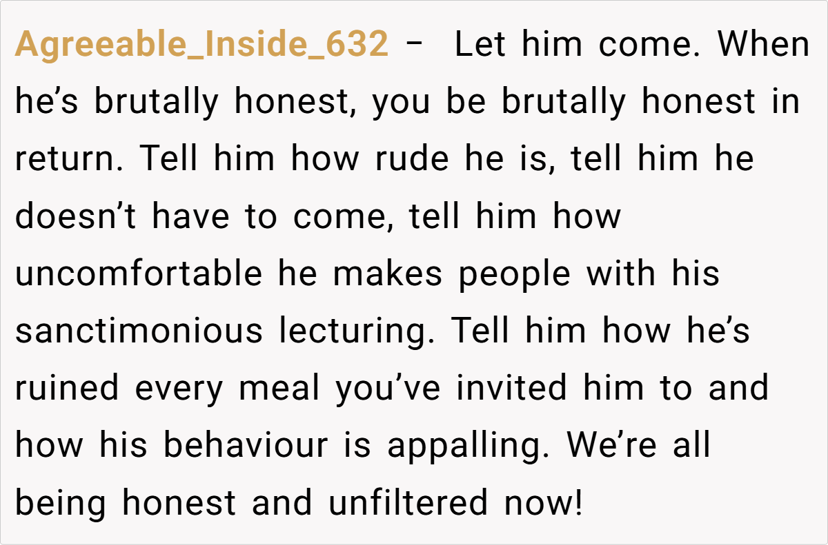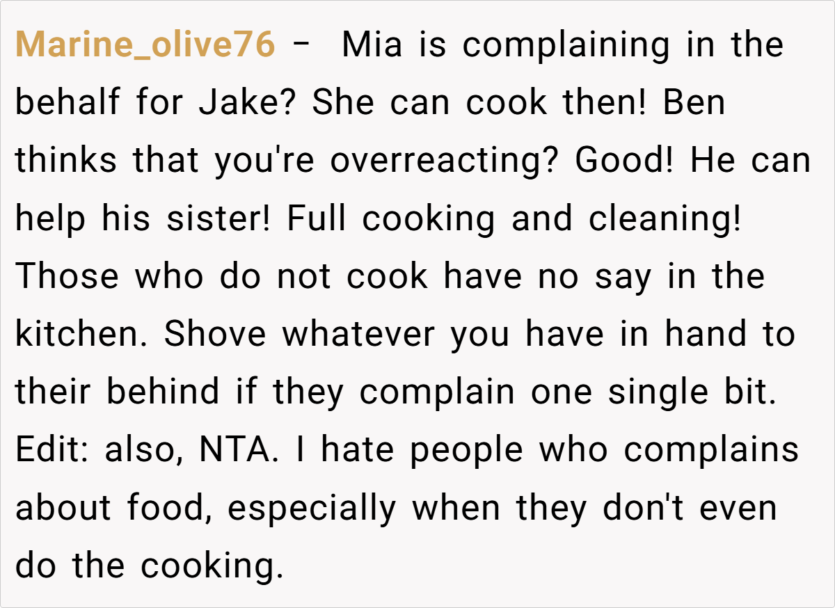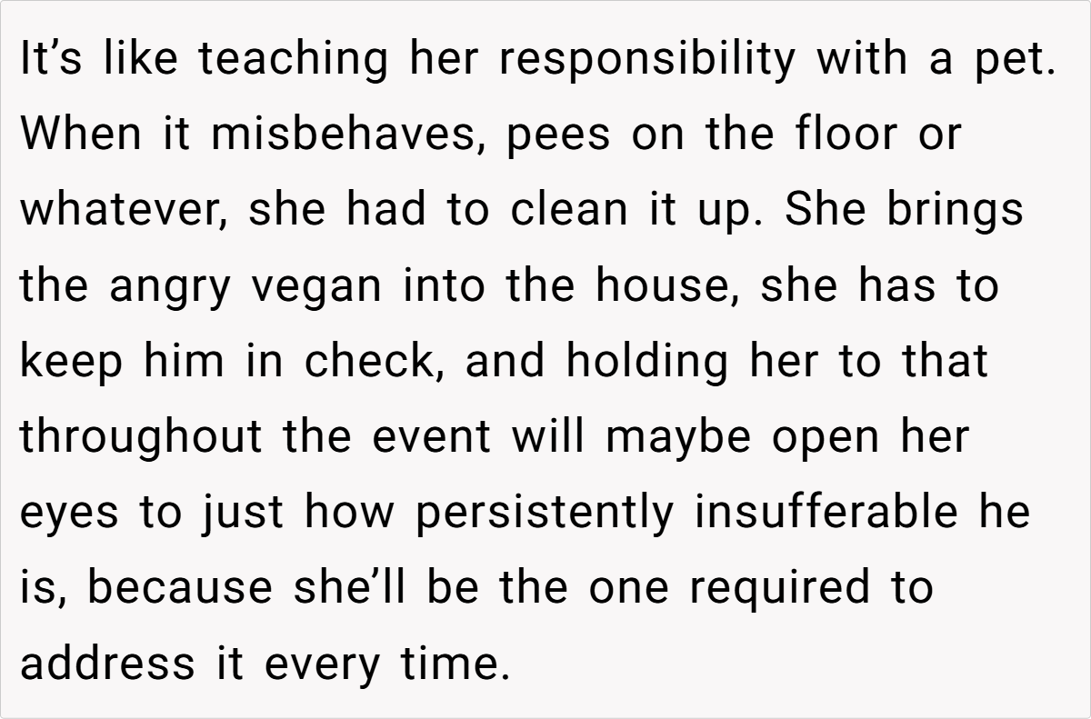 Some even suggested compromise measures—such as allowing Jake to bring his own food or enforcing a strict rule that any negative comments about the meal result in his removal from the gathering. The overwhelming consensus is that protecting the family’s joy and tradition should take precedence over catering to one person’s dietary crusade.