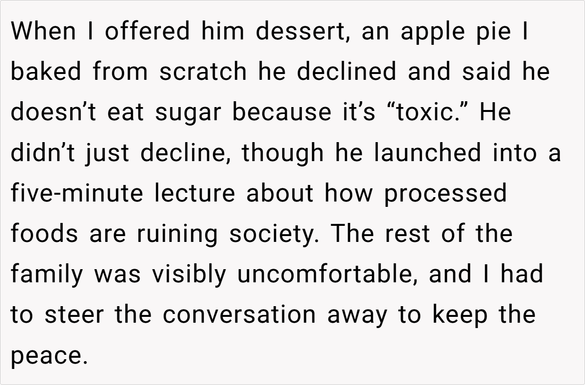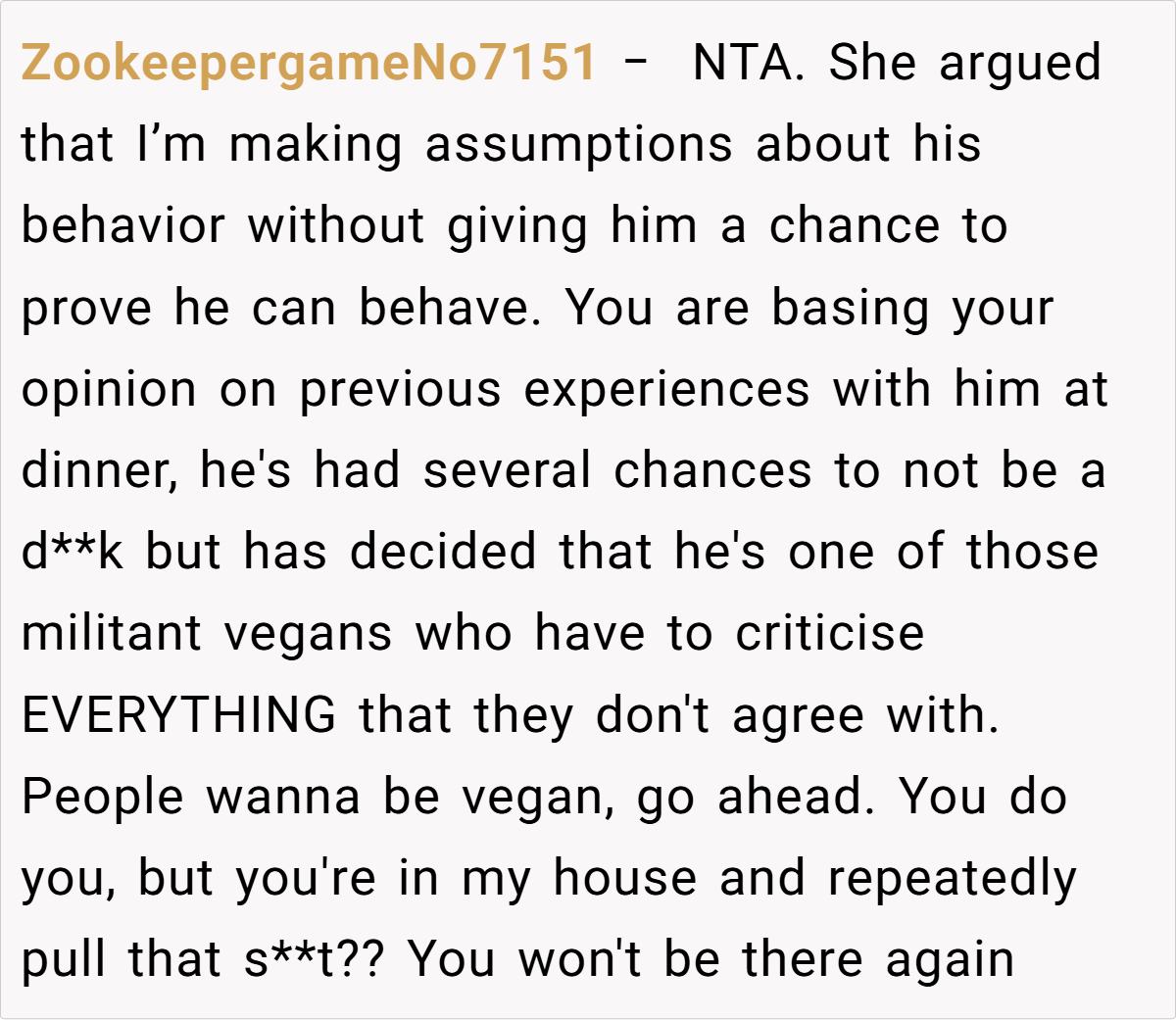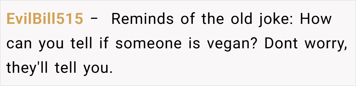 Balancing personal values with the dynamics of family gatherings can be tricky, especially when dietary choices and personal beliefs come into conflict. Relationship expert Dr. Emily Foster explains, “When a guest’s behavior repeatedly disrupts the harmony of a family event, it’s entirely within the host’s rights to establish boundaries. It’s not about silencing opinions, but about preserving an environment that is comfortable for all.”