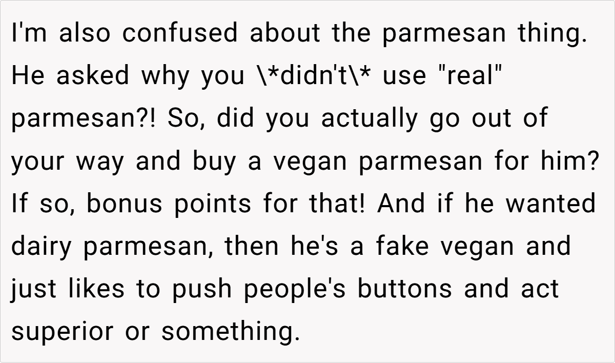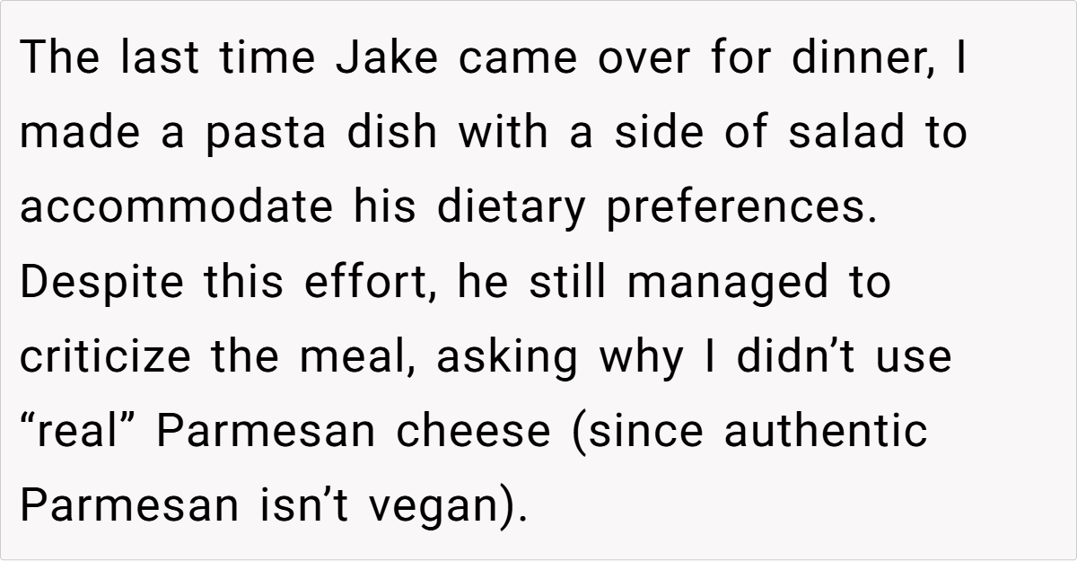 In this case, the host has gone out of her way to accommodate Jake’s vegan preferences at previous dinners, even preparing vegan pasta and salad to make him feel welcome. Yet, his incessant criticism—ranging from questioning the use of non-vegan Parmesan to decrying sugar—has repeatedly derailed the festive atmosphere.