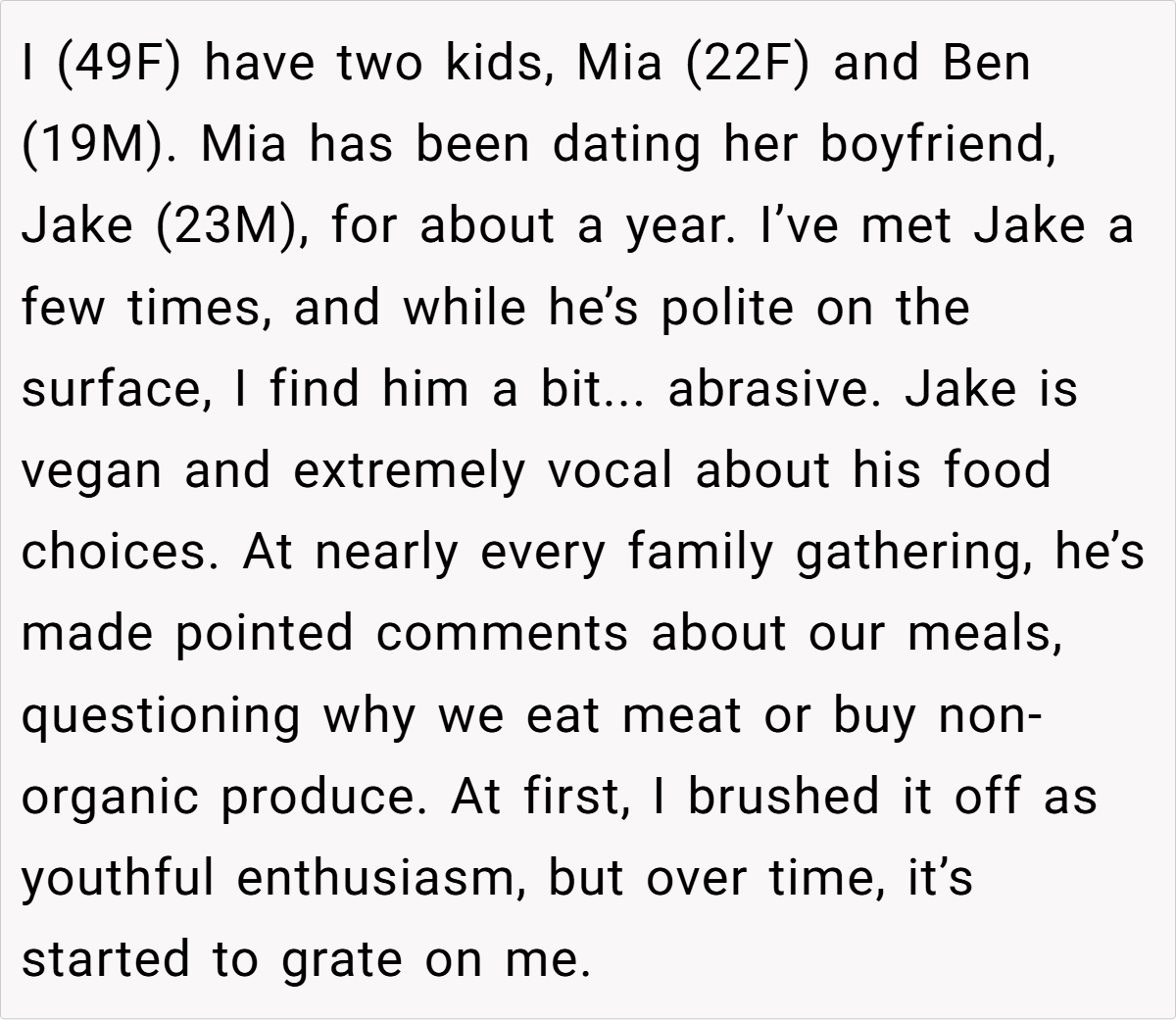 Thanksgiving is a time of tradition, family, and delicious meals—but what happens when one guest’s behavior threatens to turn the holiday into a battleground of dietary debates? In our story, a 49-year-old mother recounts her growing unease with her daughter Mia’s boyfriend, Jake, a 23-year-old vegan whose vocal opinions on food have repeatedly disrupted family dinners.