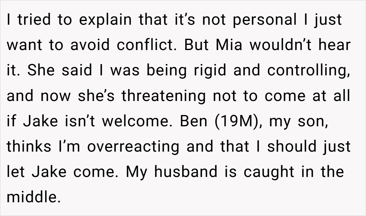While Mia argues that Jake deserves a chance to prove he can behave, her mother stands firm, insisting that her home should remain a judgment-free zone where everyone can enjoy the meal without unsolicited critiques. The stakes are high: family harmony versus individual expression, and the question remains—am I the a**hole for setting these boundaries?