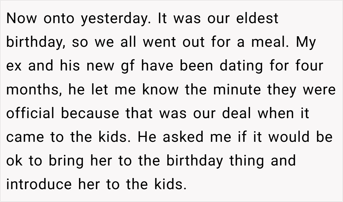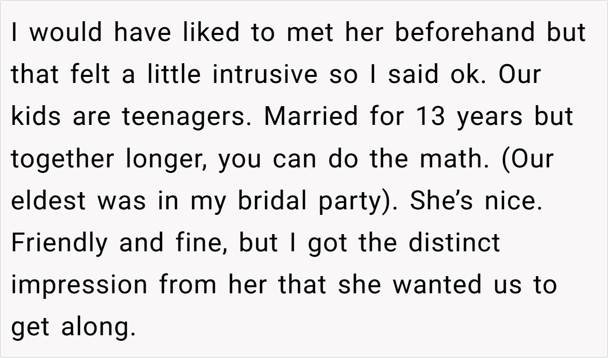 In a complex tale of blended families and lingering resentments, a woman recounts a recent interaction with her ex-husband’s new girlfriend that has sparked controversy. Despite an amicable 13‑year marriage and a strong co-parenting relationship,