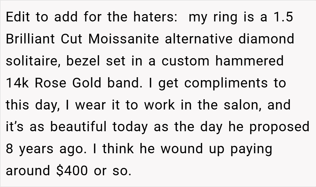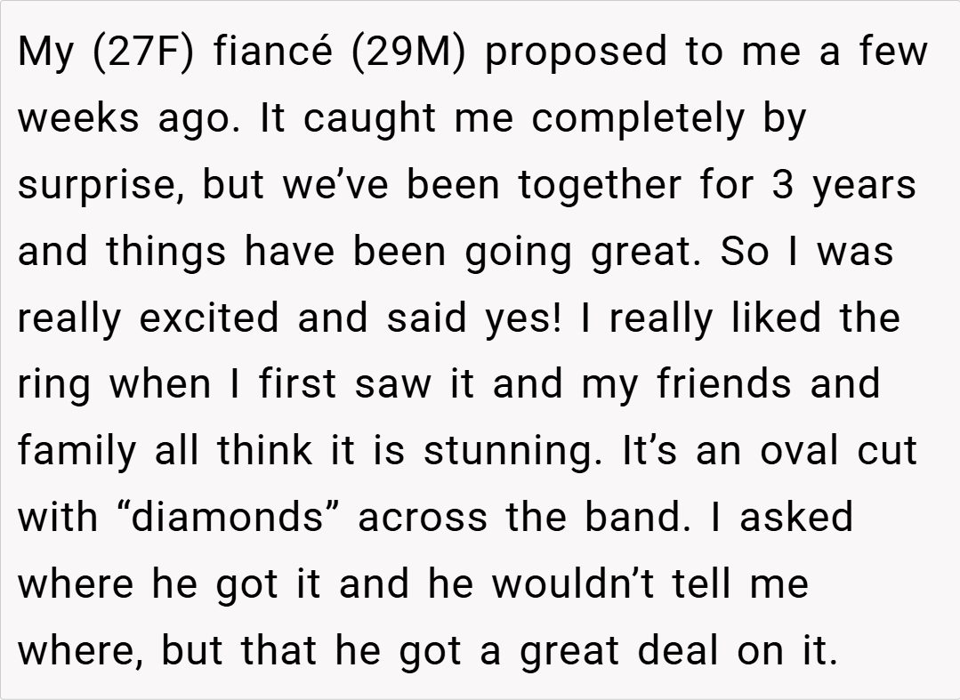 When a milestone moment like an engagement becomes overshadowed by concerns over quality and authenticity, feelings of betrayal and disappointment can quickly emerge. Our OP, a 27‑year‑old woman, recently got engaged after a three-year relationship, and initially, she loved the ring—an oval-cut design adorned with “diamonds” across the band—that her fiancé presented.