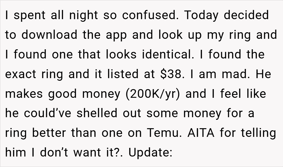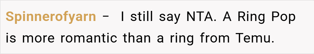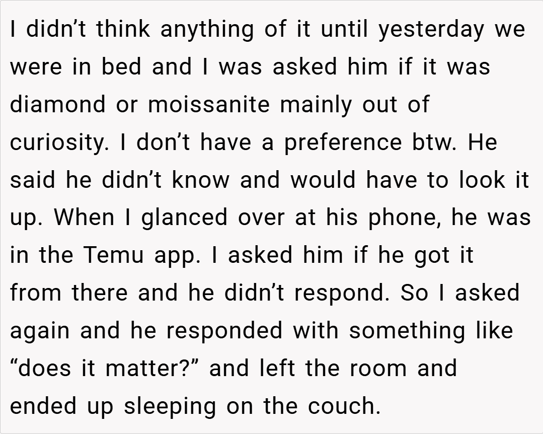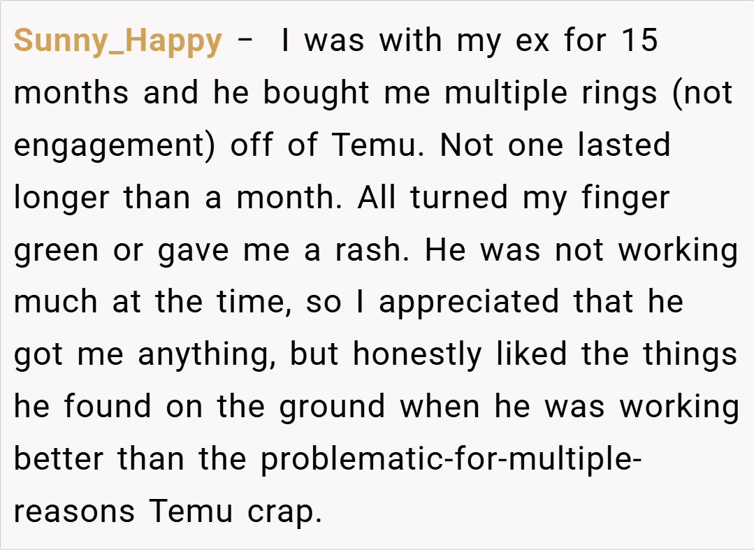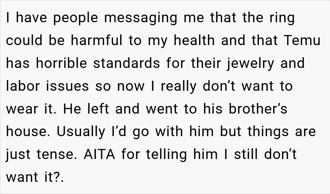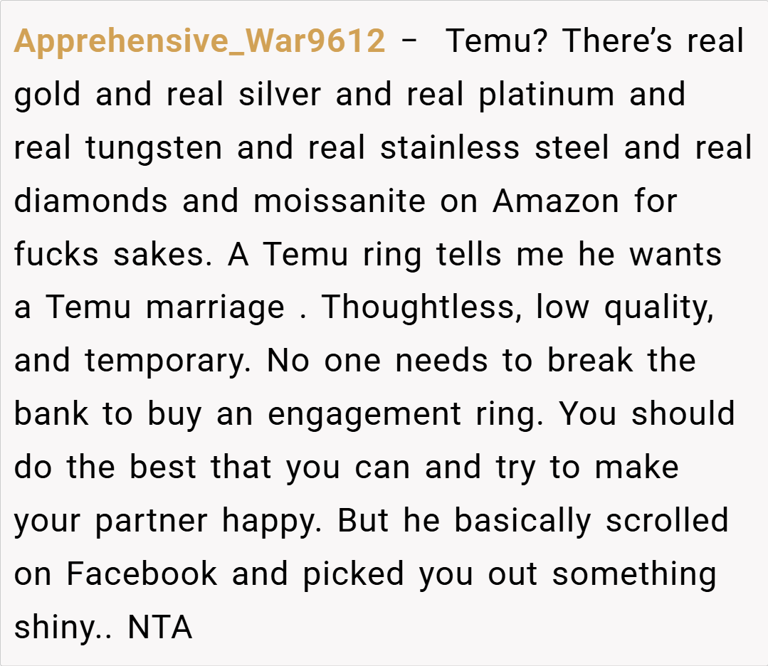 eeling that he could have afforded something of higher quality, and with troubling reviews regarding Temu’s jewelry standards and labor practices circulating online, OP voiced her refusal to accept the ring. Her fiancé’s defensive response and subsequent withdrawal have left the situation tense. Now, she wonders: Am I the asshole for telling him I don’t want my Temu engagement ring?