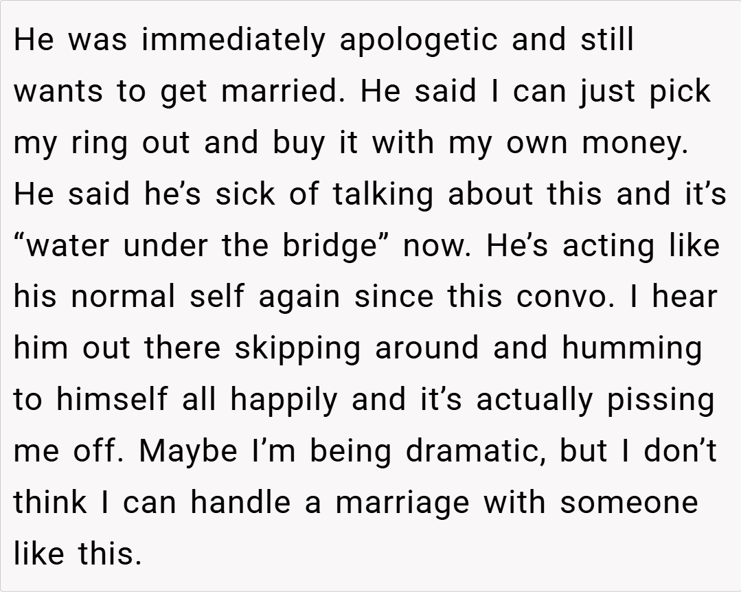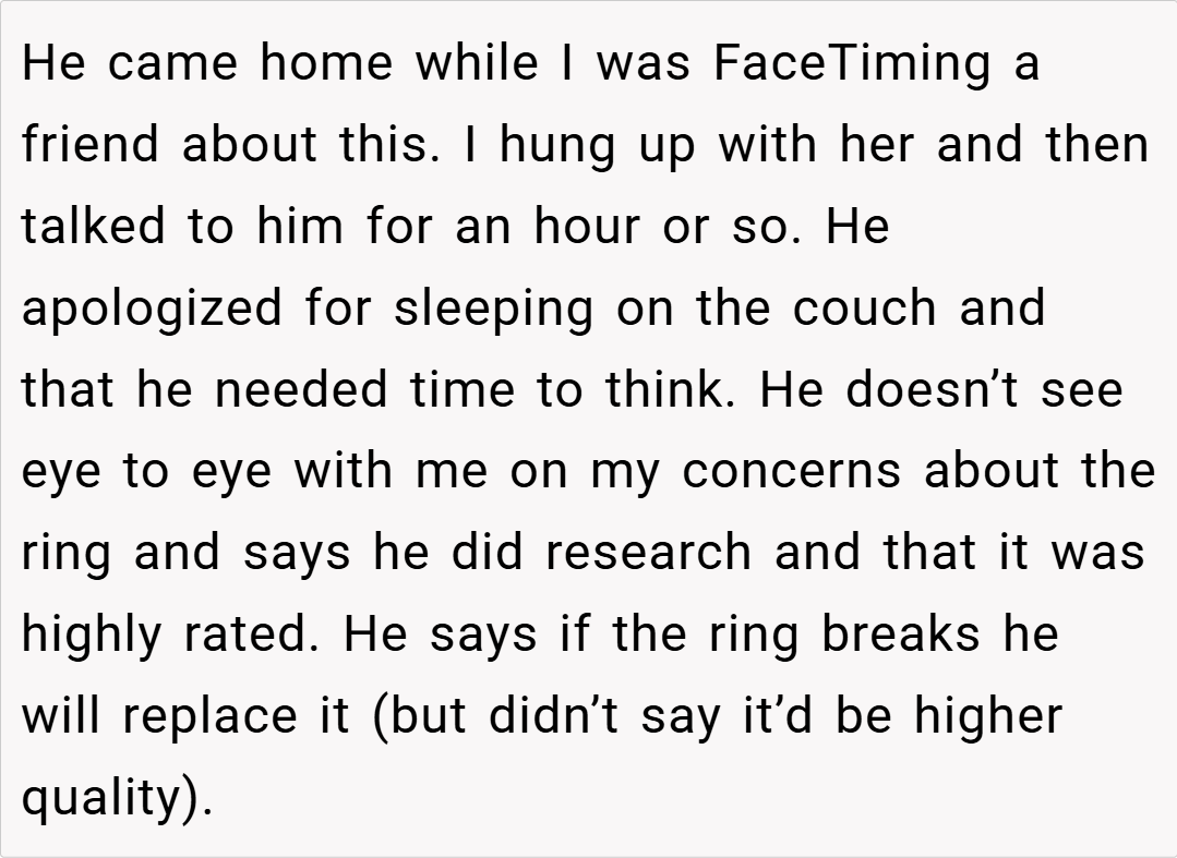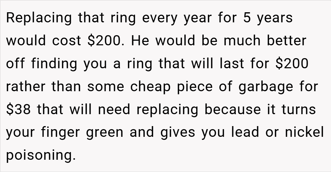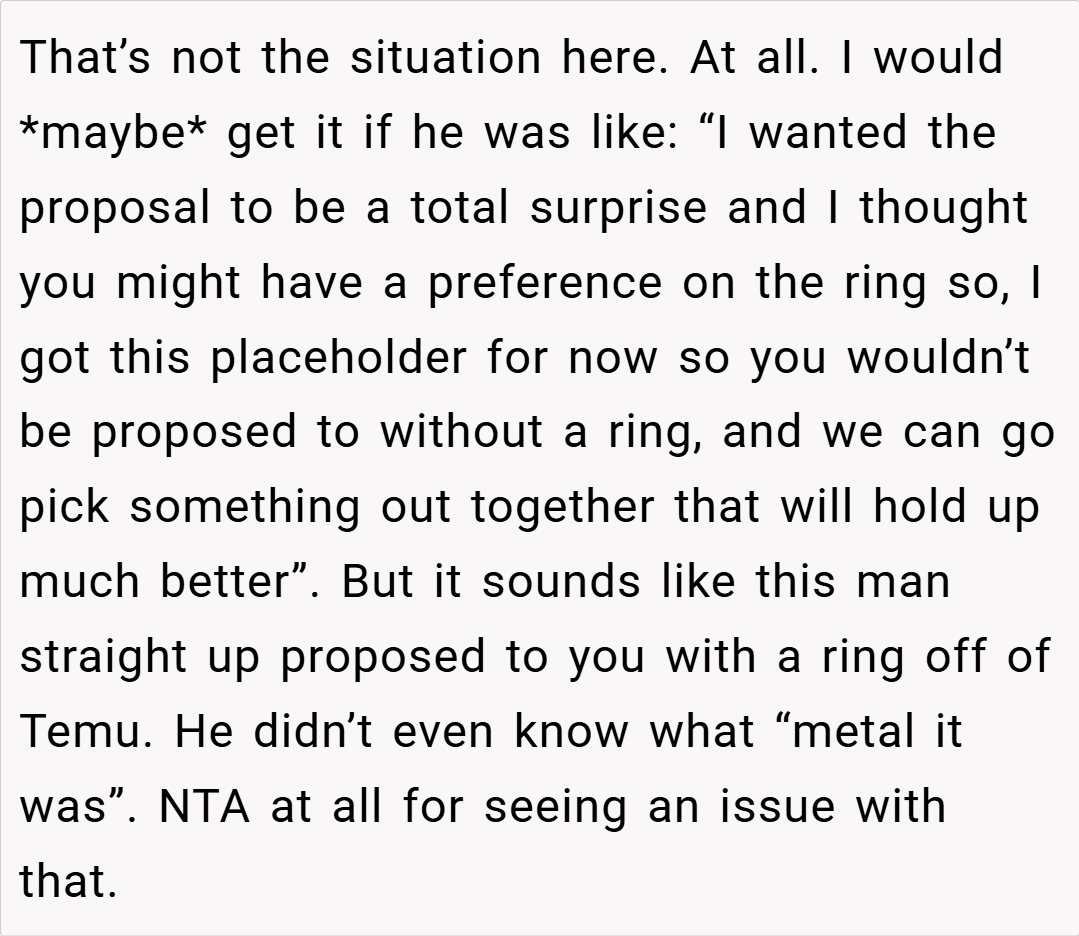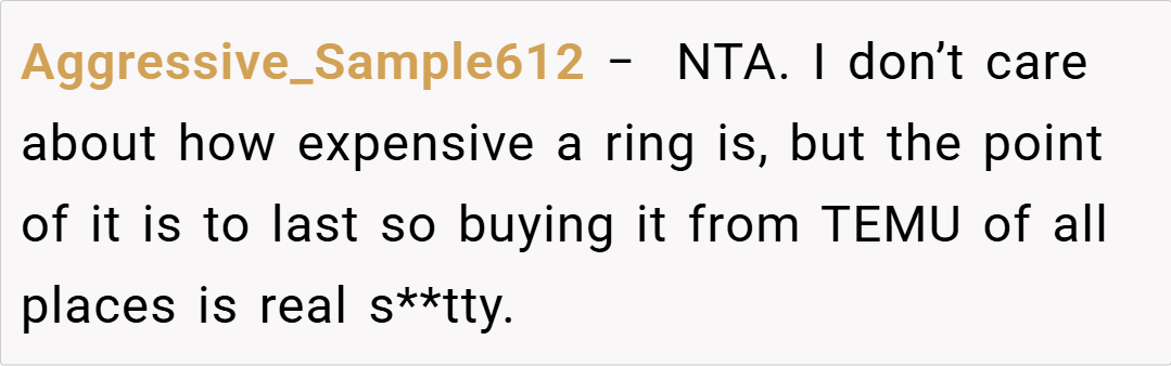 Ultimately, OP’s refusal to accept a Temu engagement ring is a stand for quality, ethics, and respect in their relationship. Given that her fiancé has the means to purchase something more significant and aligned with both her expectations and shared values, her reaction is understandable. While her fiancé’s assurance that the ring will be replaced if it breaks did little to alleviate her concerns, her decision is about more than just a piece of jewelry—it’s about the message it sends regarding their commitment.