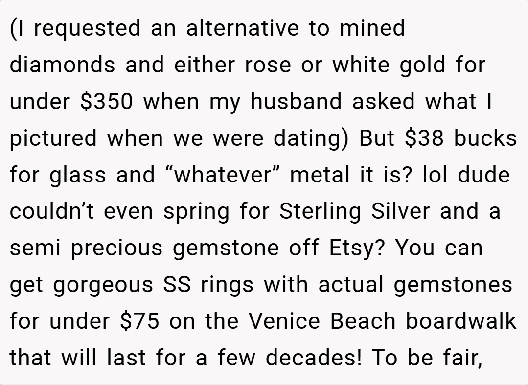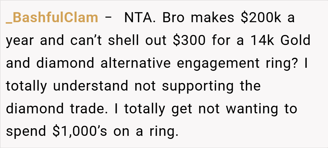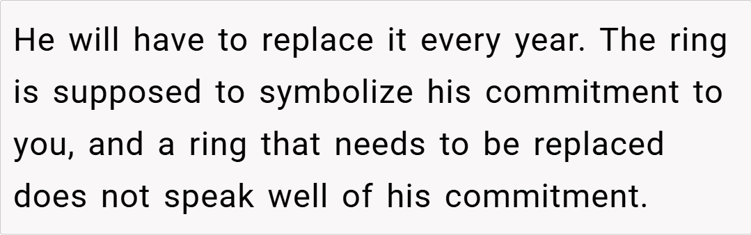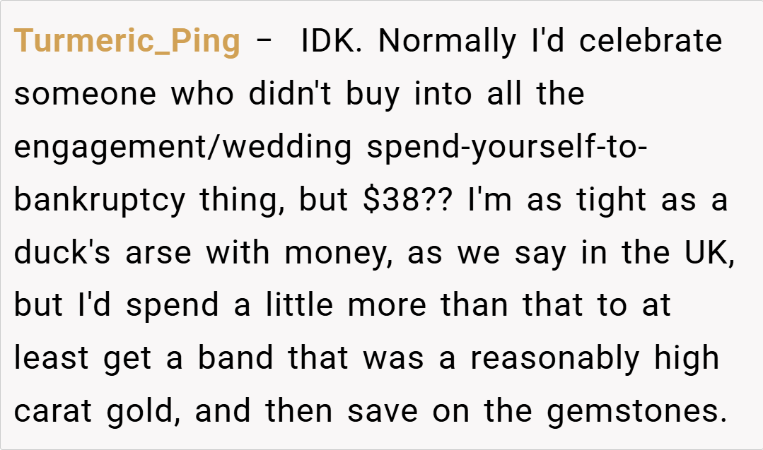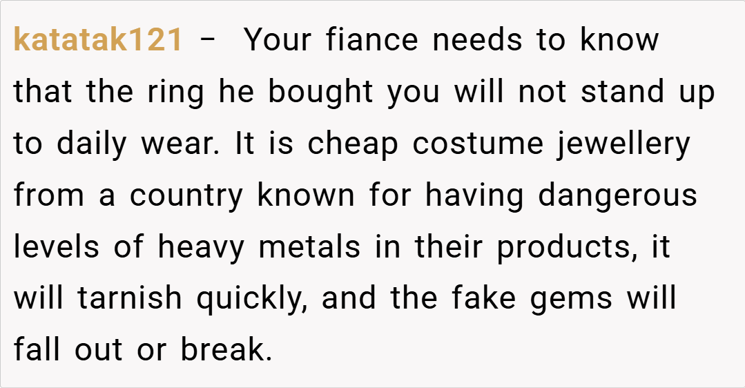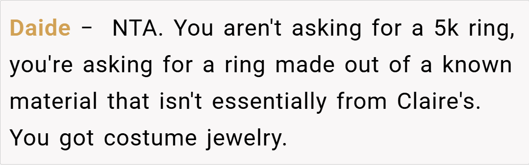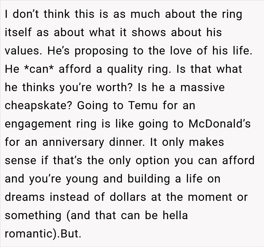 Many redditors empathize with OP’s concerns, stating that if your fiancé can easily afford a high-quality ring, settling for something from a discount site is disrespectful to the symbolism of the proposal.