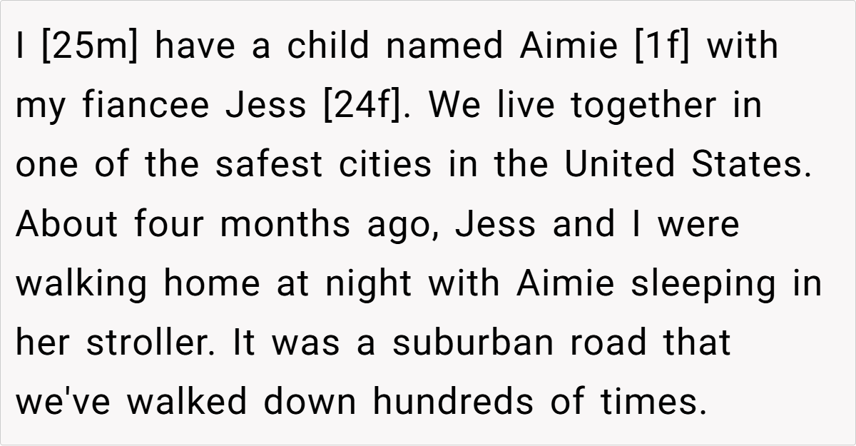 In this intense AITA story, a 25‑year‑old father and fiancé recounts an unsettling incident that exposes contrasting survival instincts between him and his fiancée, Jess. While walking home one evening with their 9‑month‑old daughter Aimie in one of the safest cities in America,