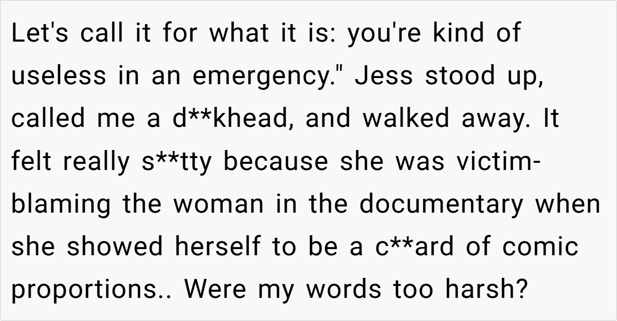 Others contend that Jess’s instinctive fear is understandable and that her desire to be seen as strong shouldn’t automatically equate to incompetence. The debate centers on whether honesty about limitations is fair—or if it unnecessarily undermines confidence in a partner.