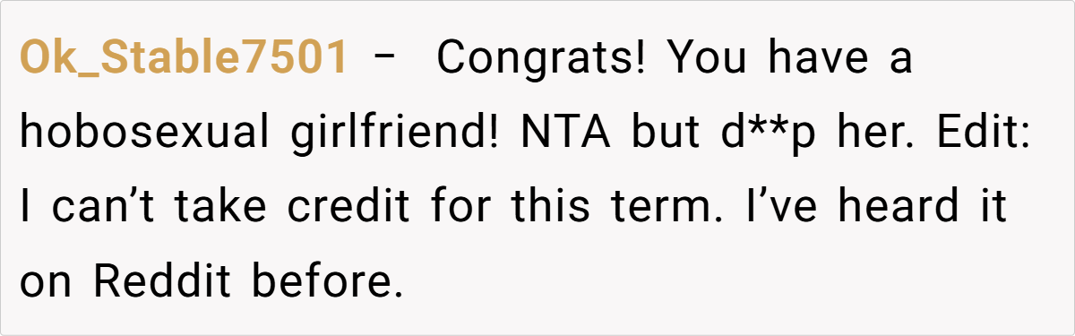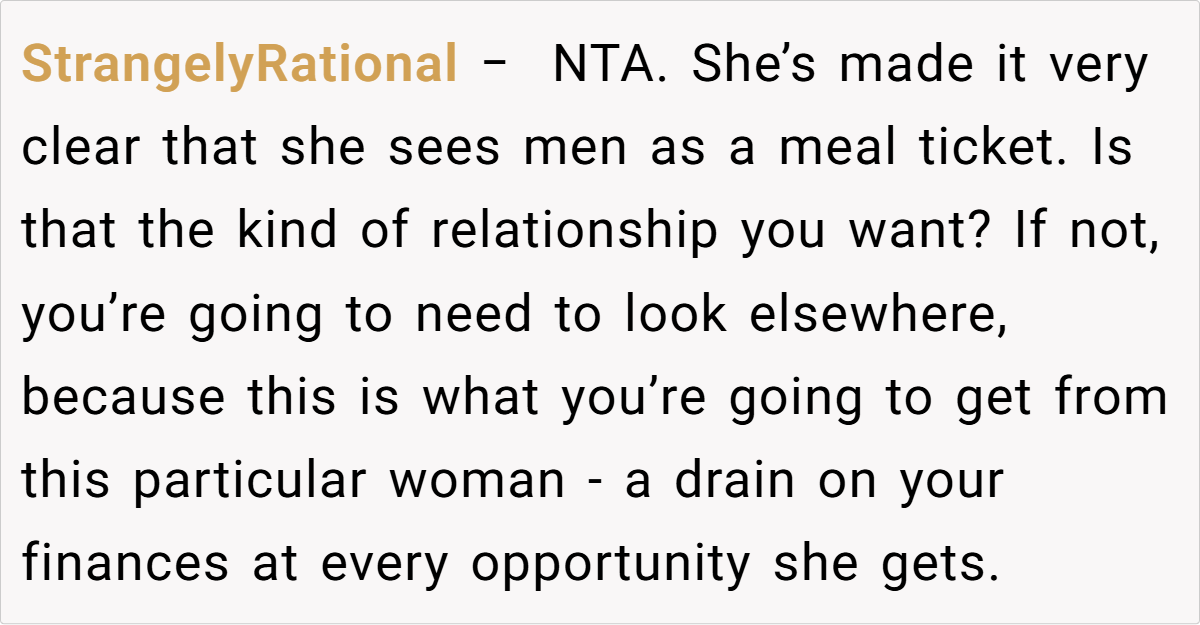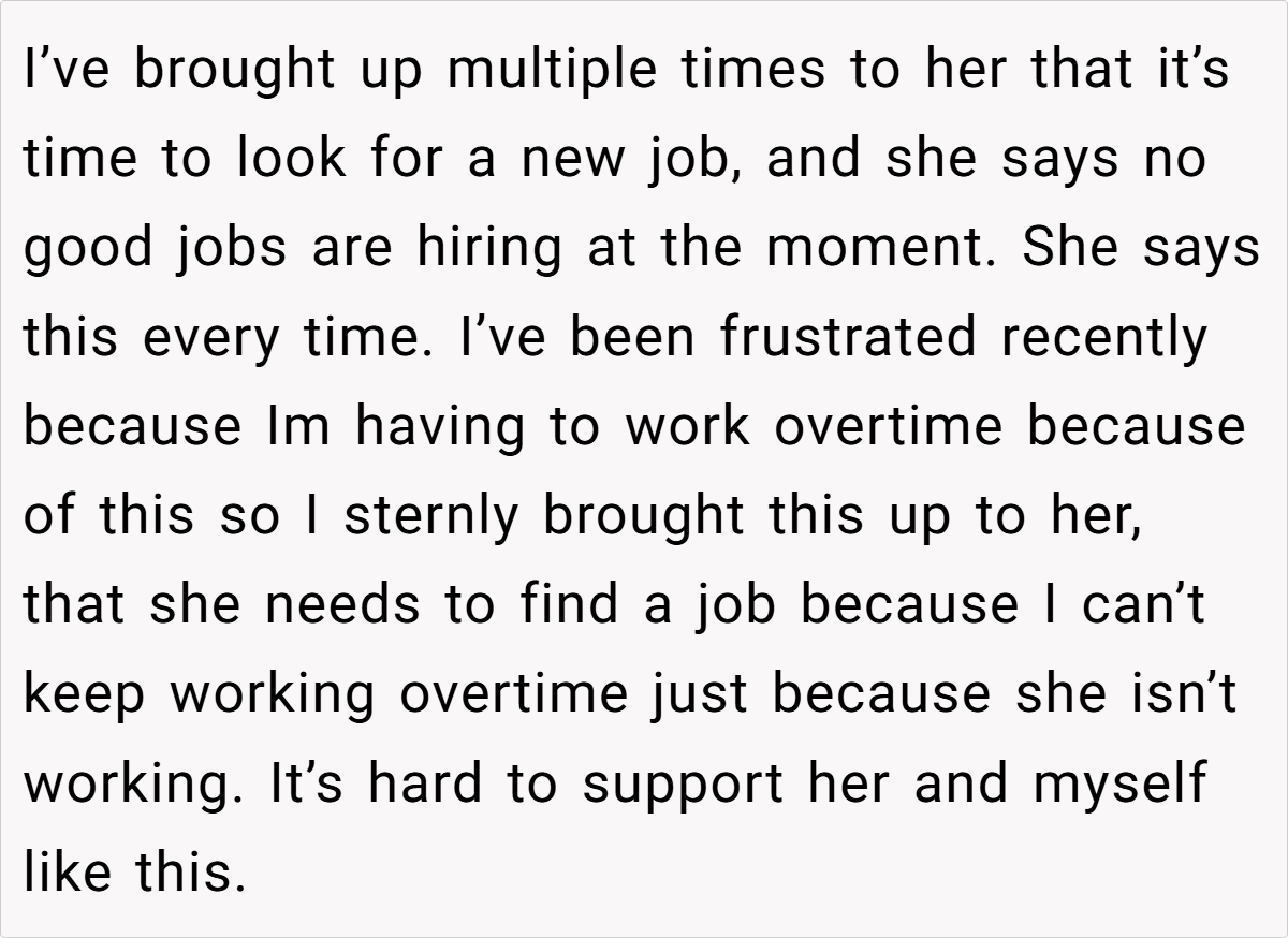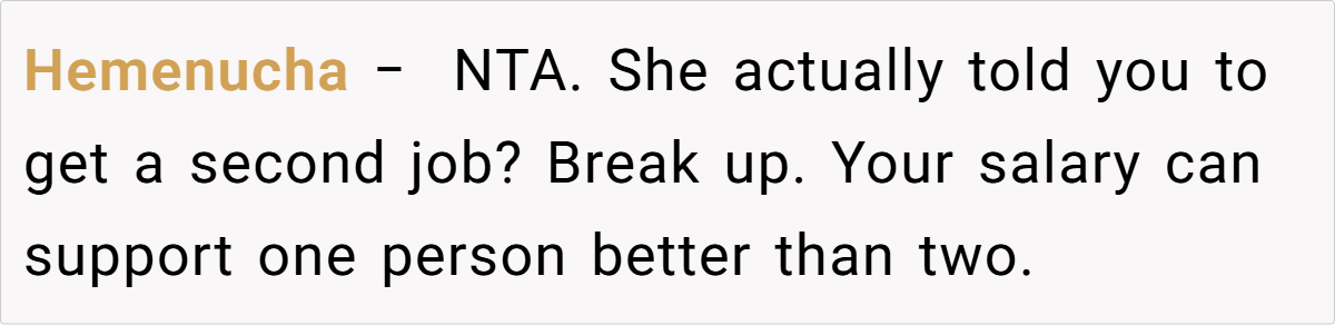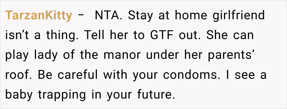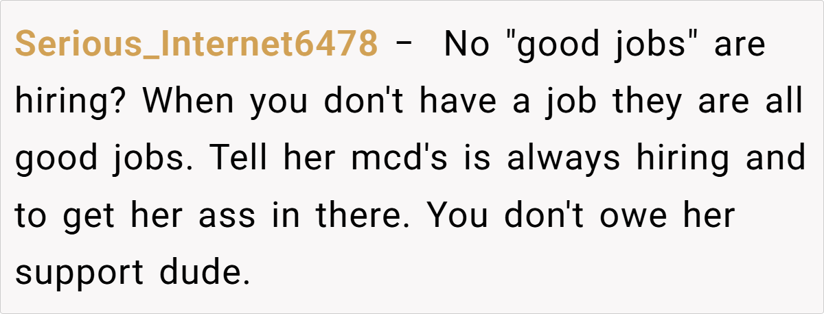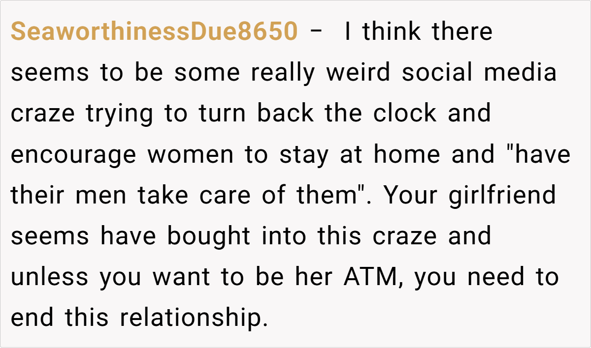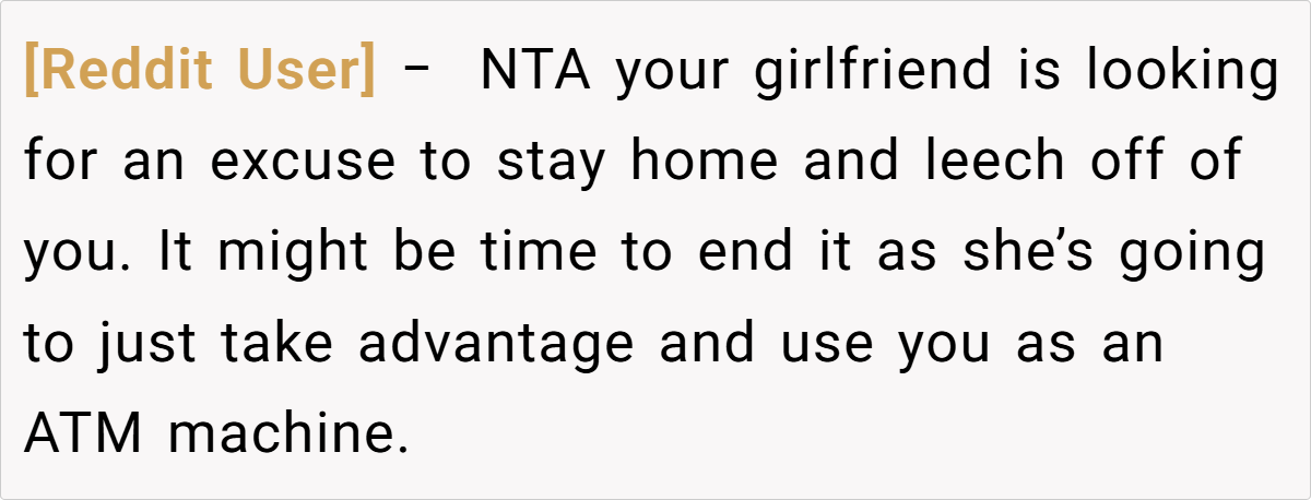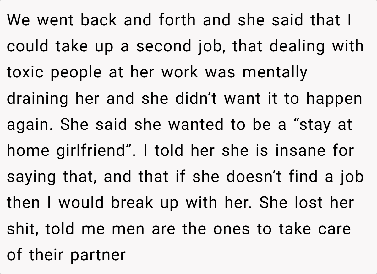 Letting your partner’s employment decisions impact the relationship’s stability is a serious issue. Financial independence and shared responsibility are cornerstones of a healthy partnership, especially when one partner’s actions lead to significant strain on the household budget. Conflicts over money are among the top predictors of relationship dissatisfaction. In this case, the narrator’s ultimatum reflects a deep-seated frustration about being the sole provider, a dynamic that can erode mutual respect over time.