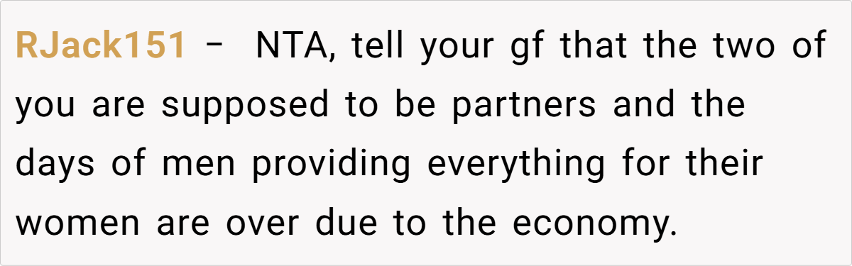 Relationship expert Dr. John Gottman notes that “couples who manage financial stress through open dialogue and shared decision-making tend to build stronger, more resilient partnerships”. His insight is particularly relevant here, where the imbalance in financial contributions is causing emotional distance.