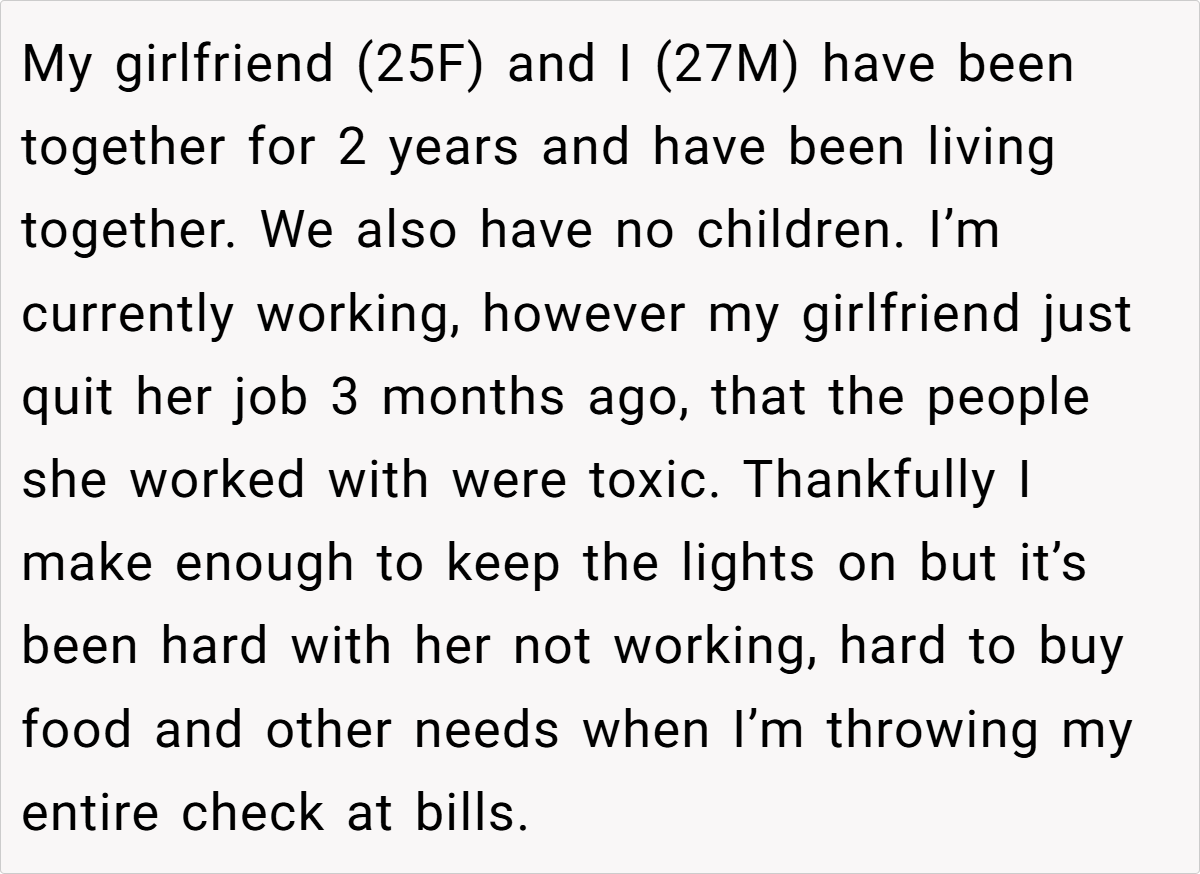 In today’s fast-paced world, managing personal finances while nurturing a relationship can feel like walking a tightrope. In this Reddit post, we explore a couple’s struggle where differing views on employment and financial responsibility spark conflict. The narrator, a 27-year-old working man, expresses growing frustration as his 25-year-old girlfriend has opted out of the workforce after quitting a toxic job. With bills piling up and overtime hours becoming the norm, the pressure of supporting two lives is weighing heavily on him.